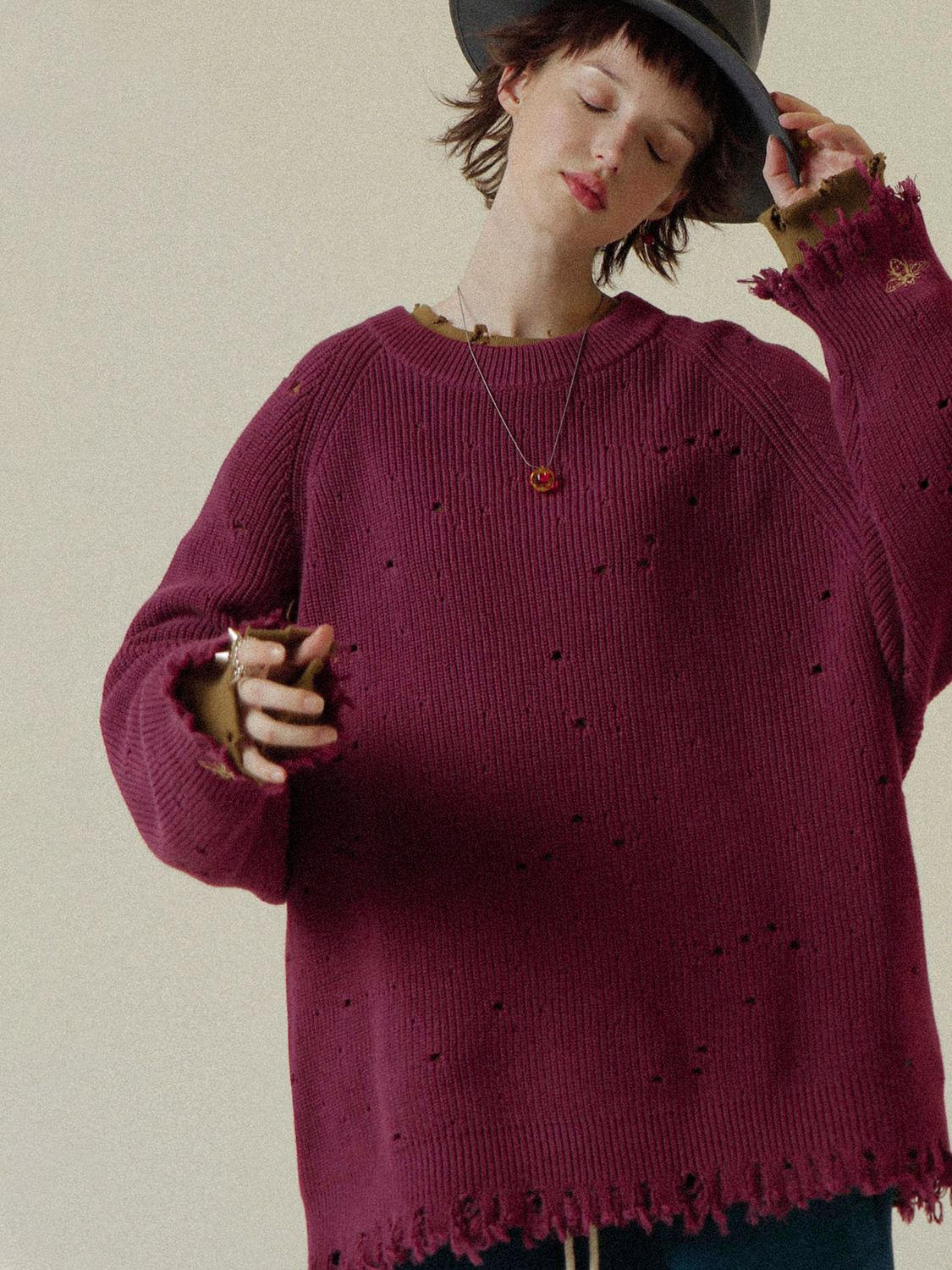 UNVESNO AW19 retro autumn pure color breaking hole flow Su Leisure Lazy Loose Lovers Knitted Sweater Sweater
