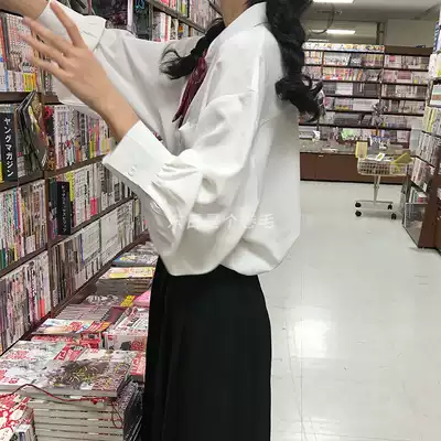 Dongri is a curly Japanese college style white long-sleeved bow tie shirt for female students loose bow shirt