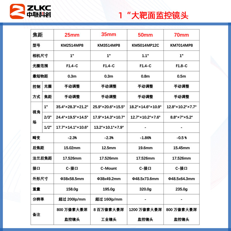 Focal length 8mm KM0814MP8 focal length 12mm KM1214MP8 focal length 16mm KM1614MP8C focal length 20mm KM