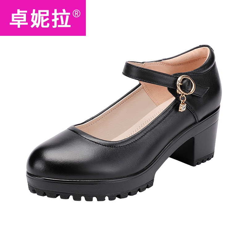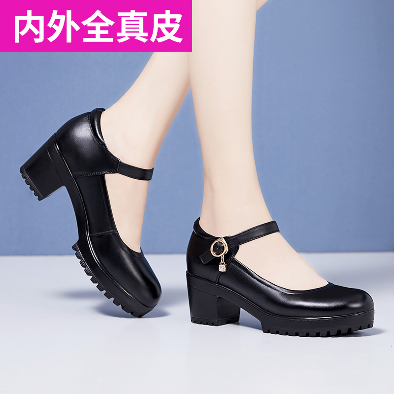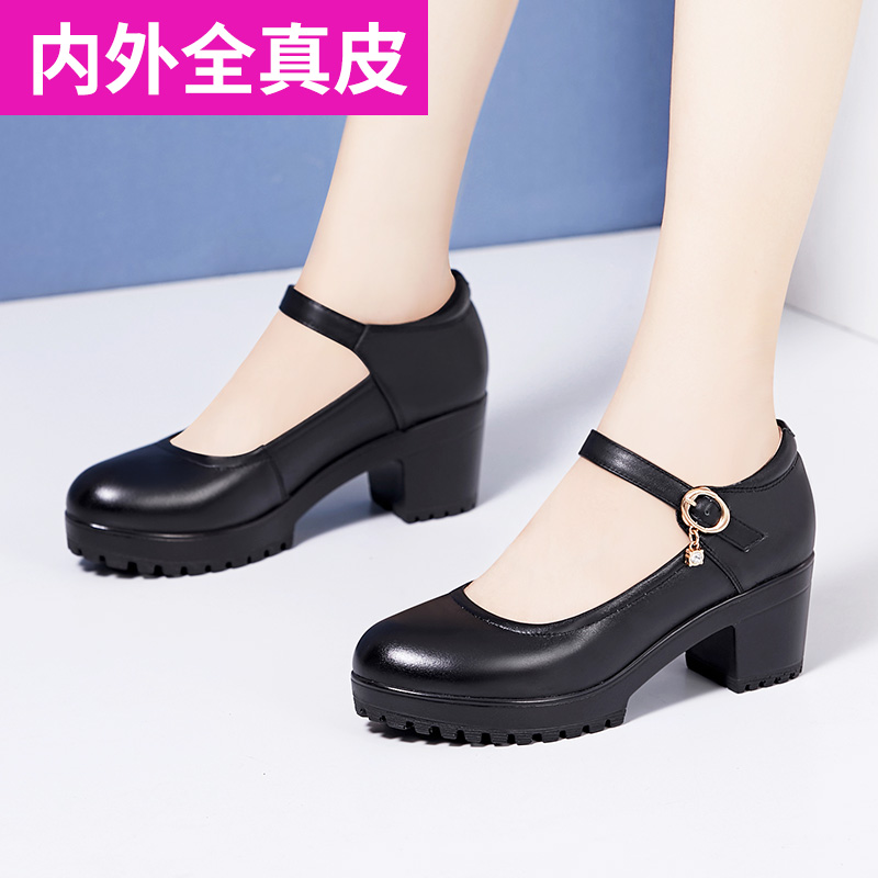 Soft cowhide middle-aged and elderly cheongsam model catwalk shoes middle heel mother shoes thick heel leather round toe black single shoes women's shoes
