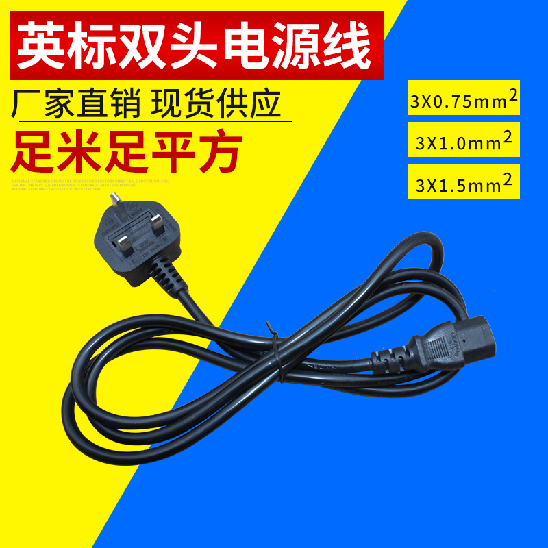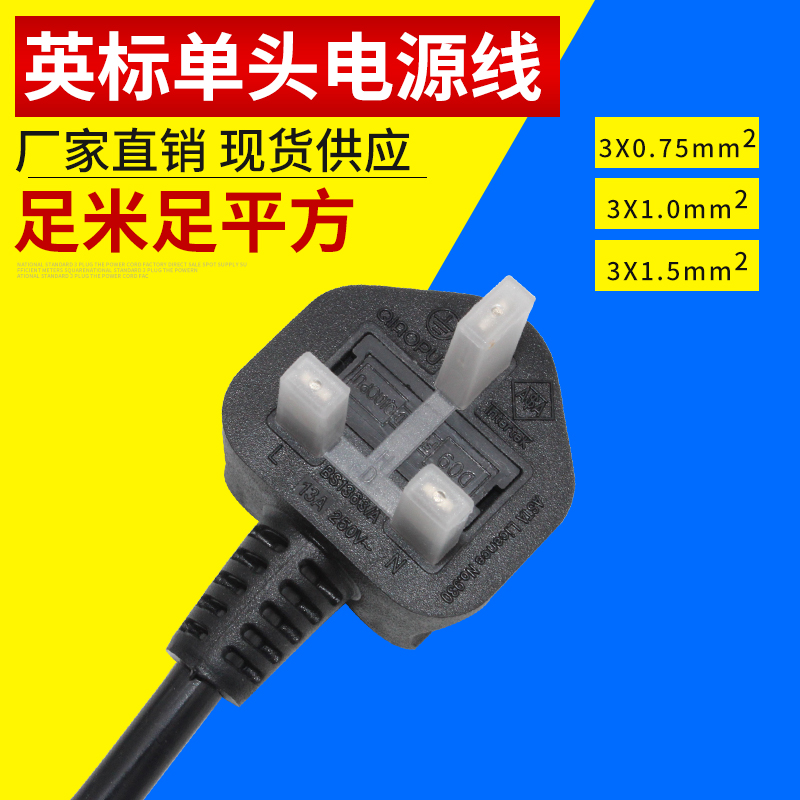 British standard power cord pure copper BS certified three-hole 3-core 0 75 1 1 5 square British plug with wire insurance
