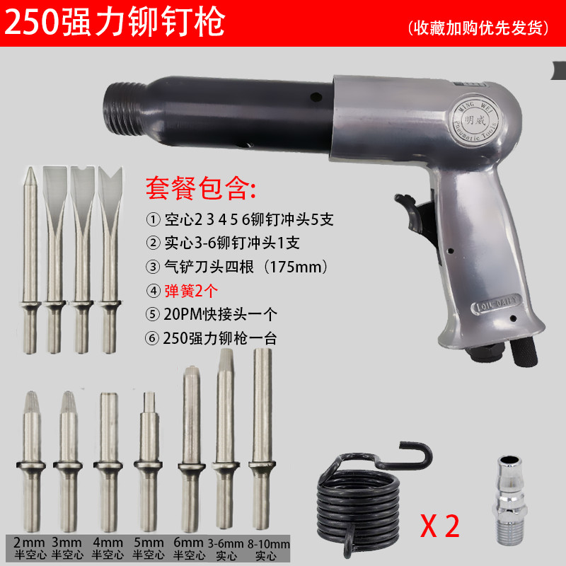 190 rivet guns + optional 2 rivets 190 riveting guns + a full set of 5 riveting heads 250 riveting guns + optional 2 riveting heads 250 riveting guns + a full set of 5 rivets 2030R industrial riveting guns + optional 2 rivets 2030R industrial riveting guns + a full set of 7 rivets 190 air shovels 250 gas shovels 2030R air shovels need to be equipped with a self-locking head can contact customer service