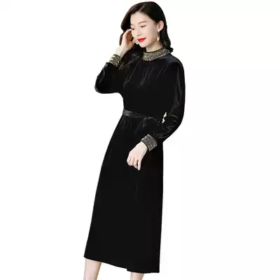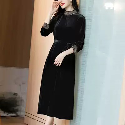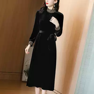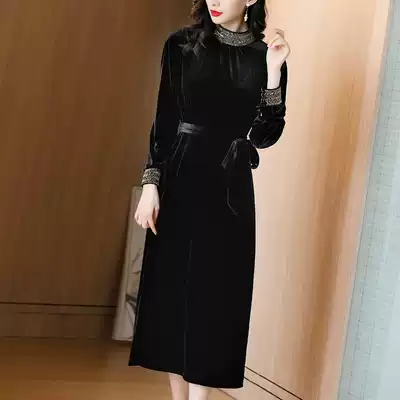 Black velvet dress women long sleeves spring and winter new high-end fashion temperament golden velvet skirt Noble foreign pie