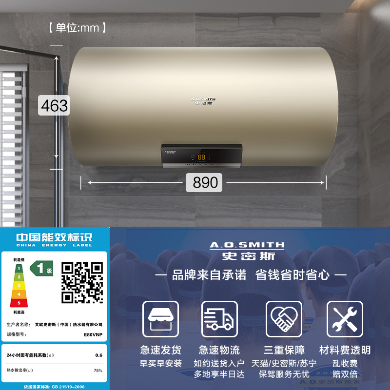 AO Smith's official flagship water heater Electric Home Installation Speed Heat WiFi Intelligent storage water 60L80 liters VNP