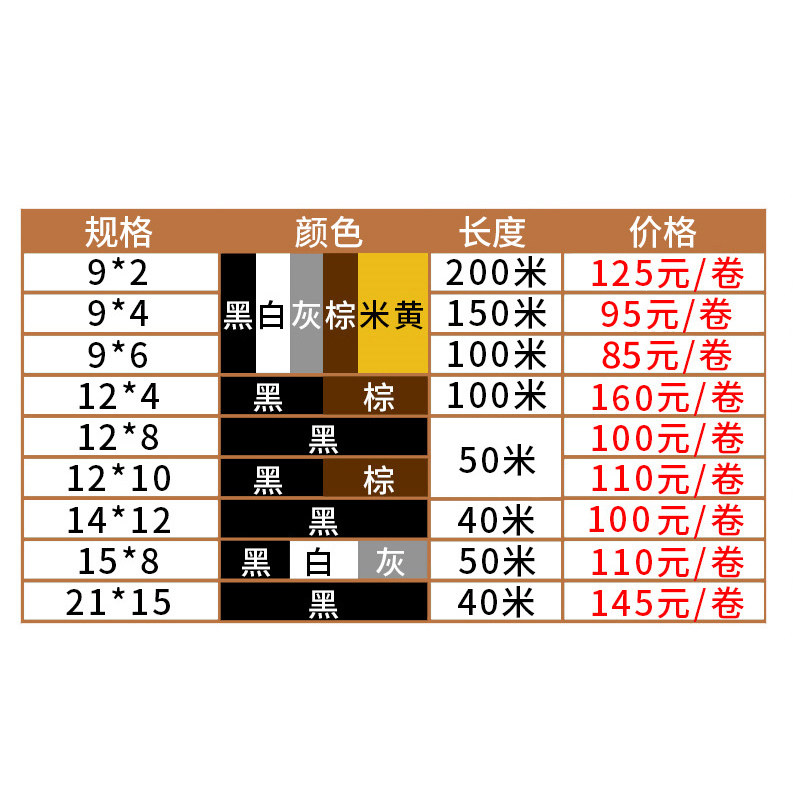 Type d brown 9 * 6 whole rolls 100 m E type brown 9 * 4 whole rolls 150 m I type brown 9 * 2 whole rolls 200 m D type white 9 * 6 whole rolls 100 m E type white