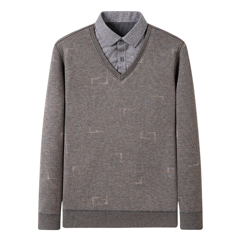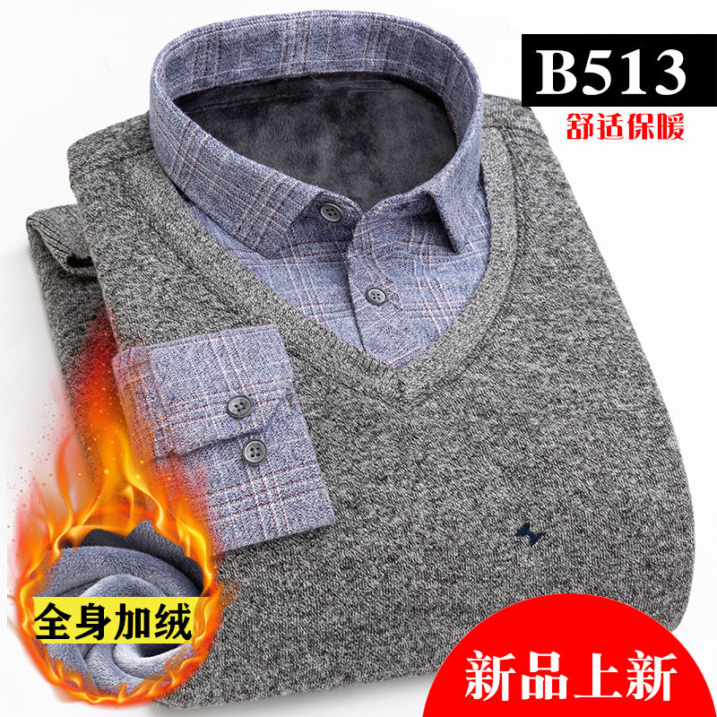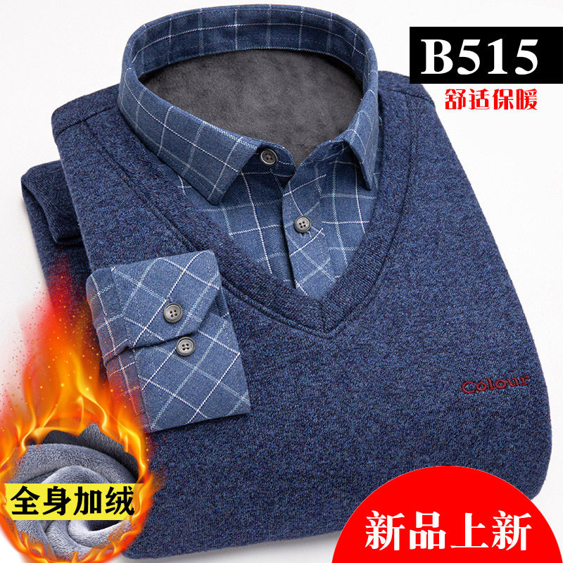 Men's heating clothes thickened and velvet fake two-piece young men's thermal shirt collar outer wear middle-aged men's top winter