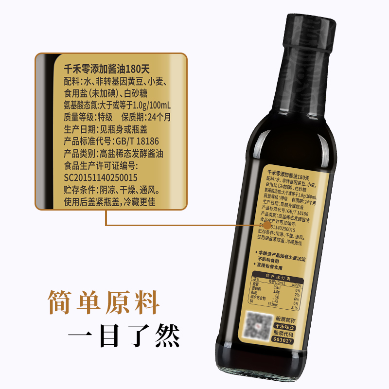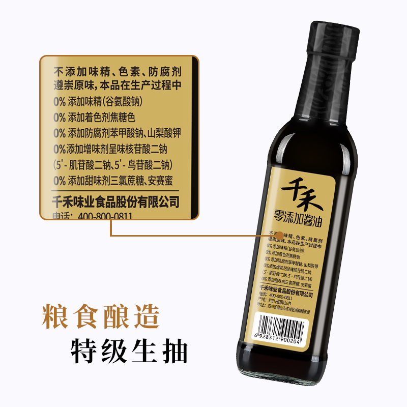 4 bottles of Qianhe zero-added first-class soy sauce Yuzang brewed 180 days 500ml non-genetically modified premium soy sauce