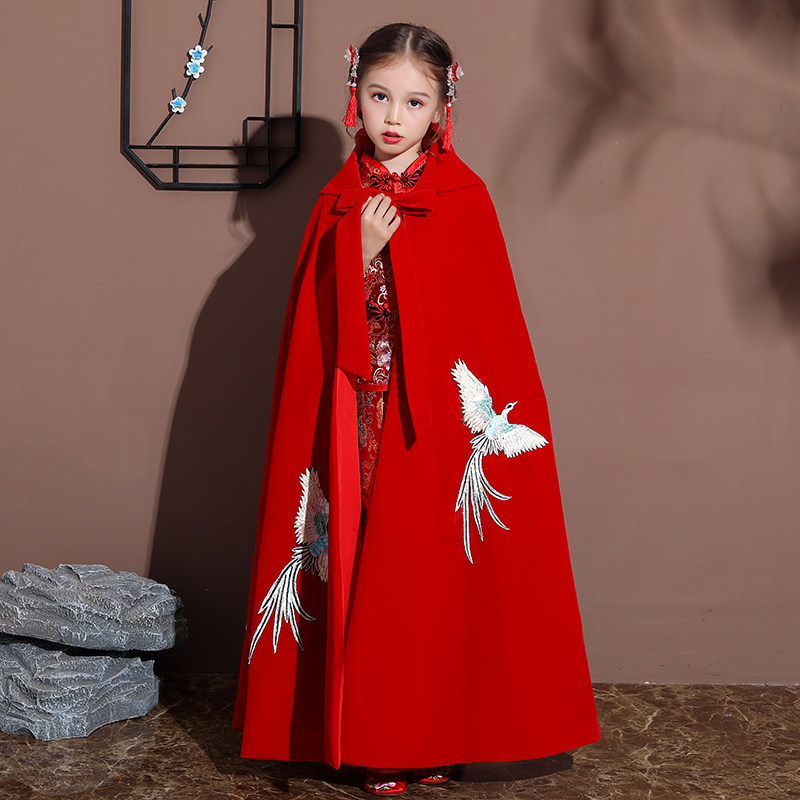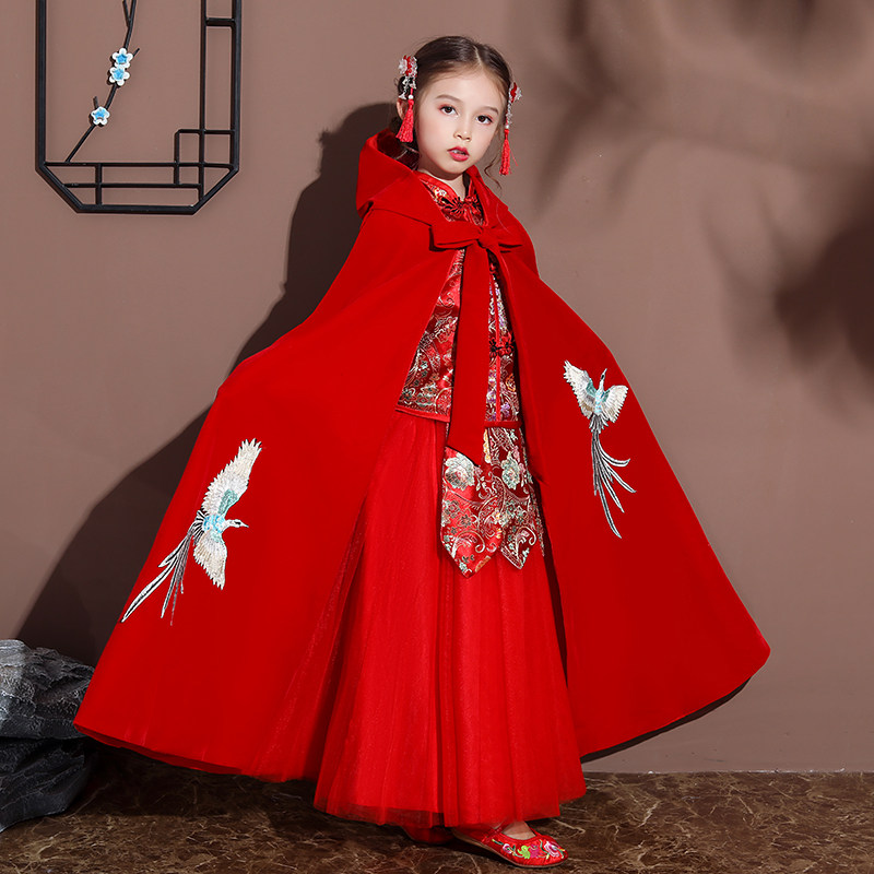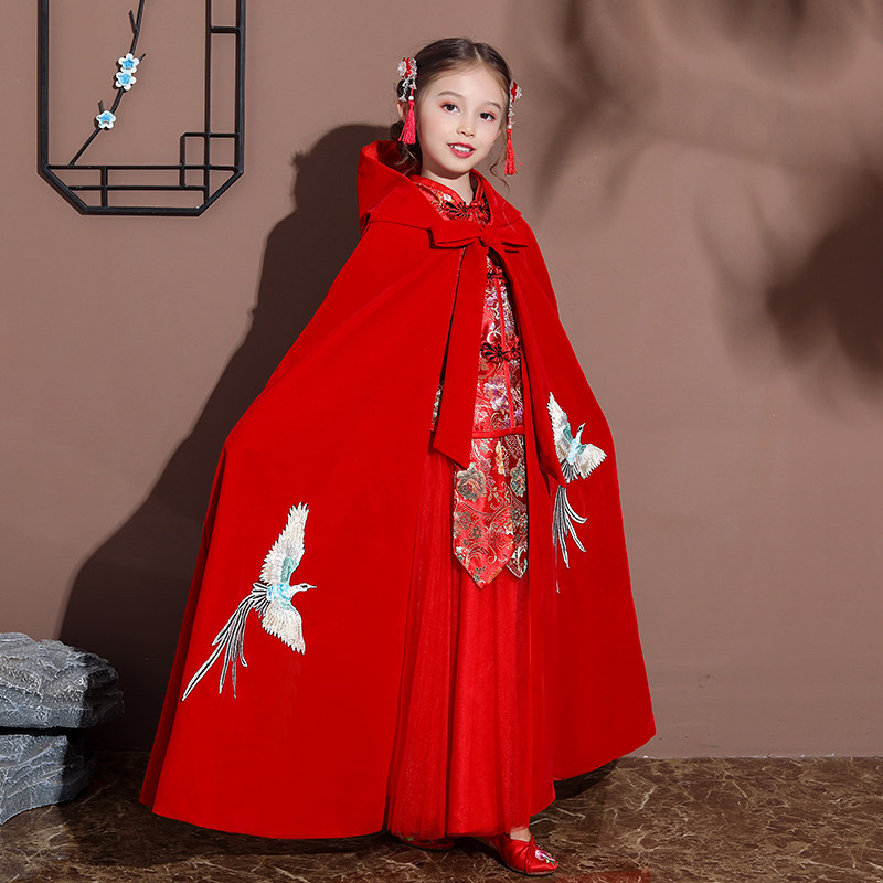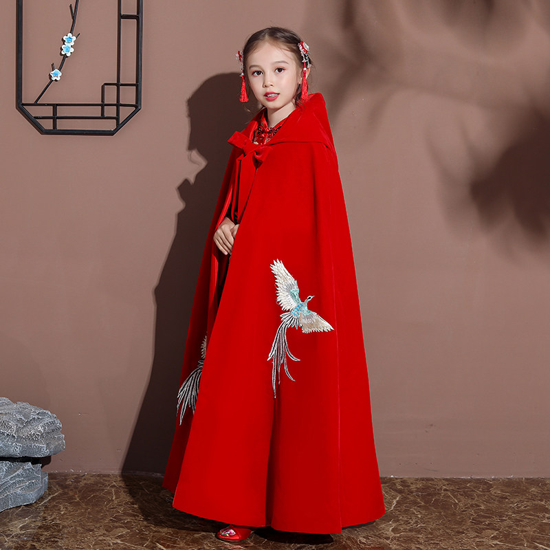 Girls' cape cloak embroidery autumn and winter out children's Hanfu hooded princess foreign style long style ancient wind shawl jacket