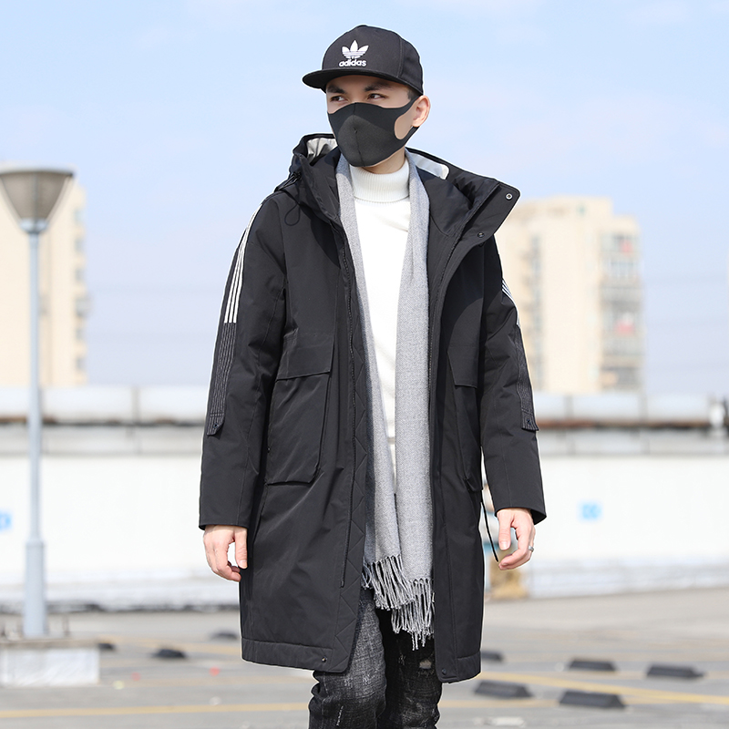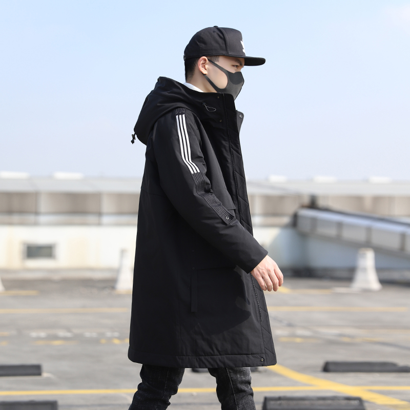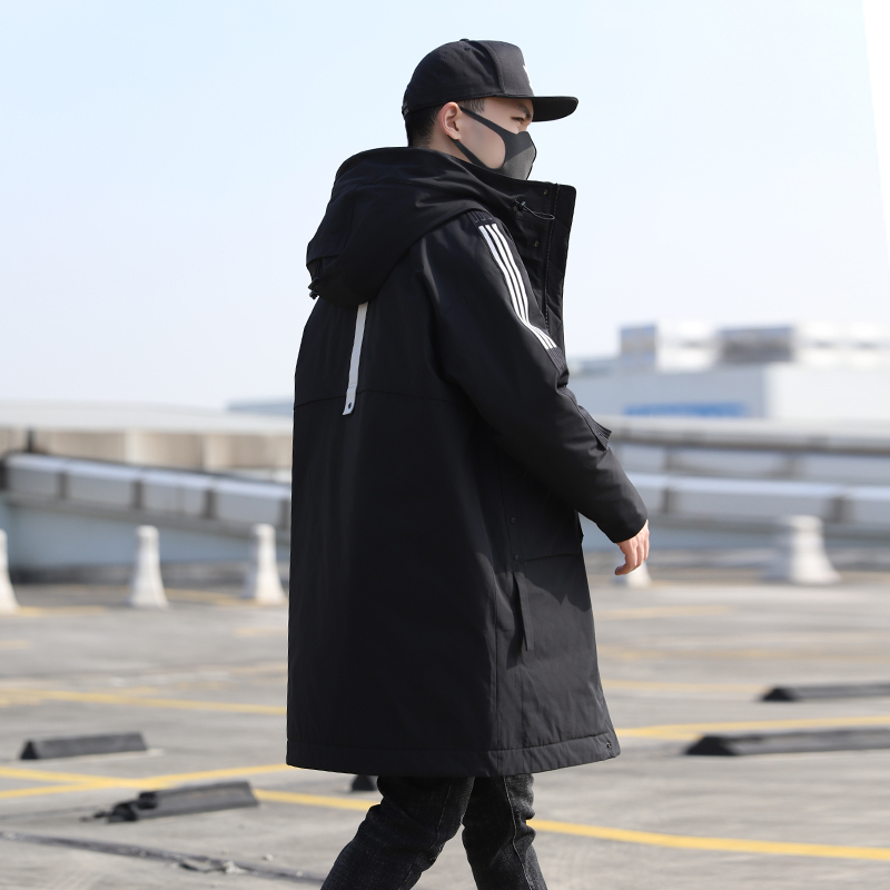 Down jacket Men's medium long version of striped thickened winter coat Chauder stream tooling handsome with a kneecap-burst white duck down