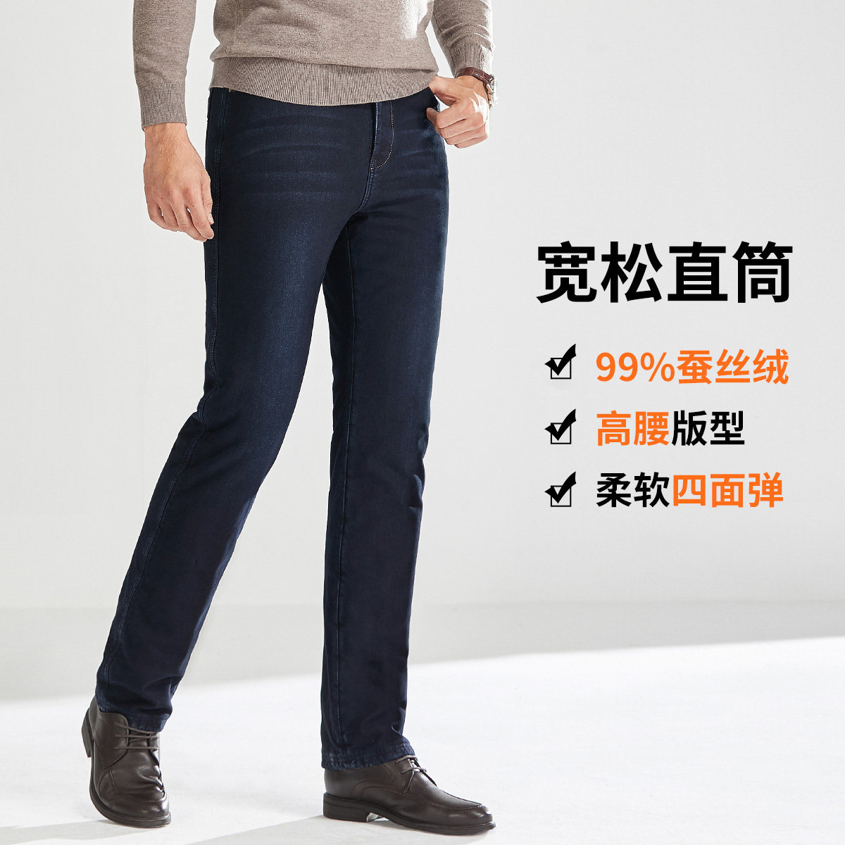 Jiechun winter silk plus velvet jeans high-end men's cotton pants elastic thickening loose straight pants men's high waist
