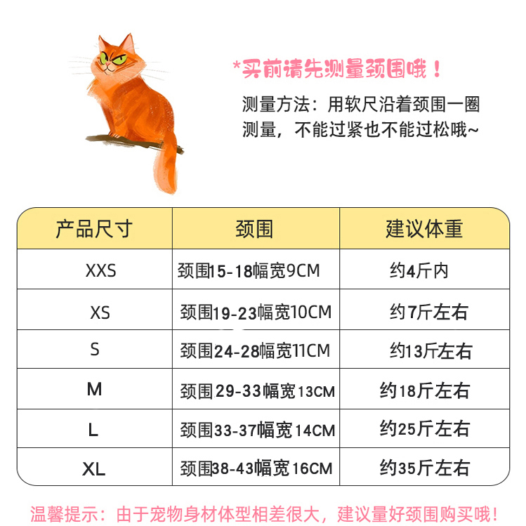 XXS-neck circumference 15 -18cm about 4 catties XS-neck circumference 19-23cm about 5-7 kg S-neck circumference 24-28cm (please gauge neck circumference) M -