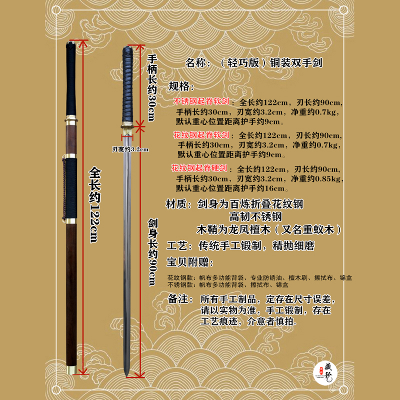 Stainless steel ridged soft sword Cotton rope handle Patterned steel ridged soft sword Cotton rope handle Patterned steel ridged hard sword Cotton rope handle Stainless steel ridged soft sword Plus PU hand glue handle Patterned steel ridge