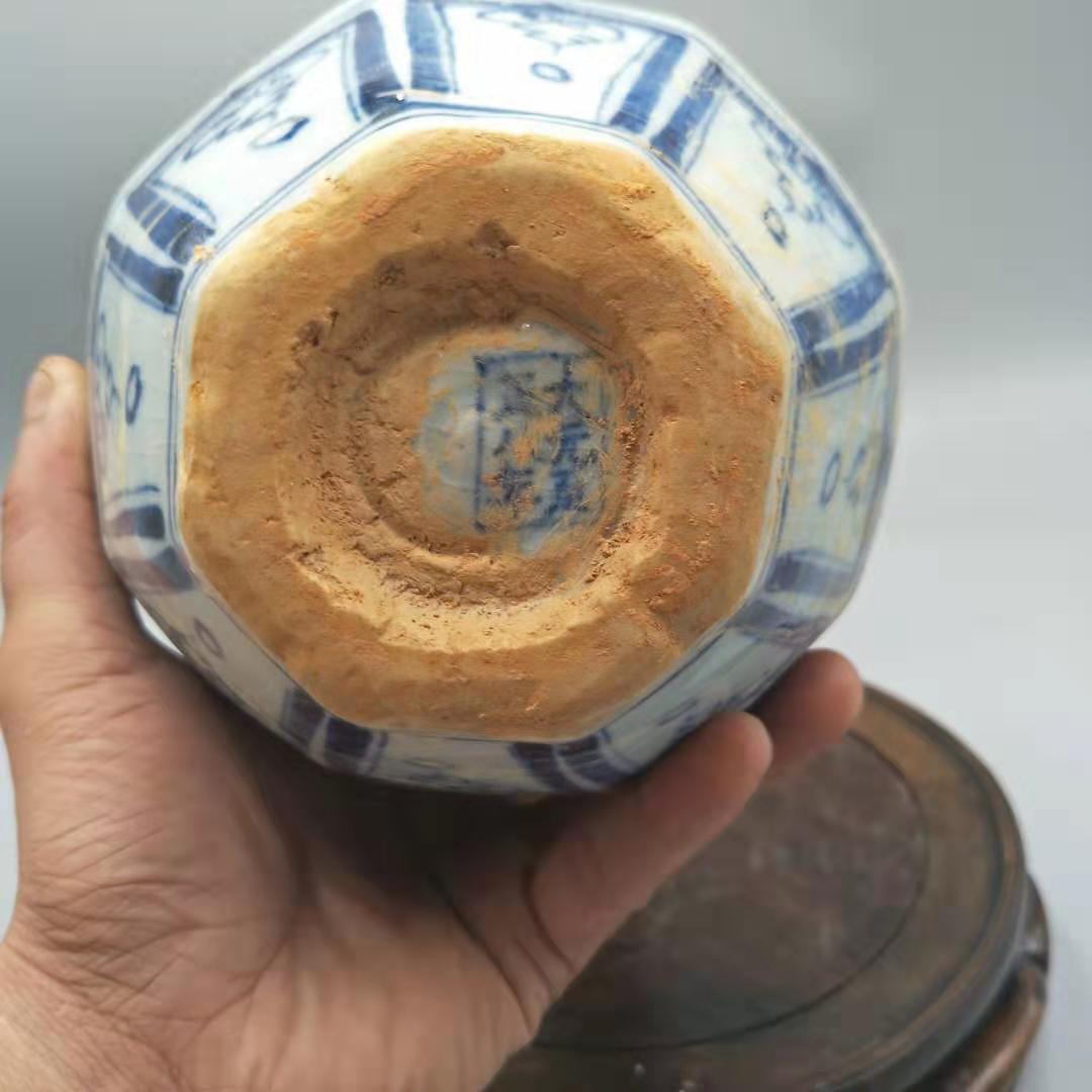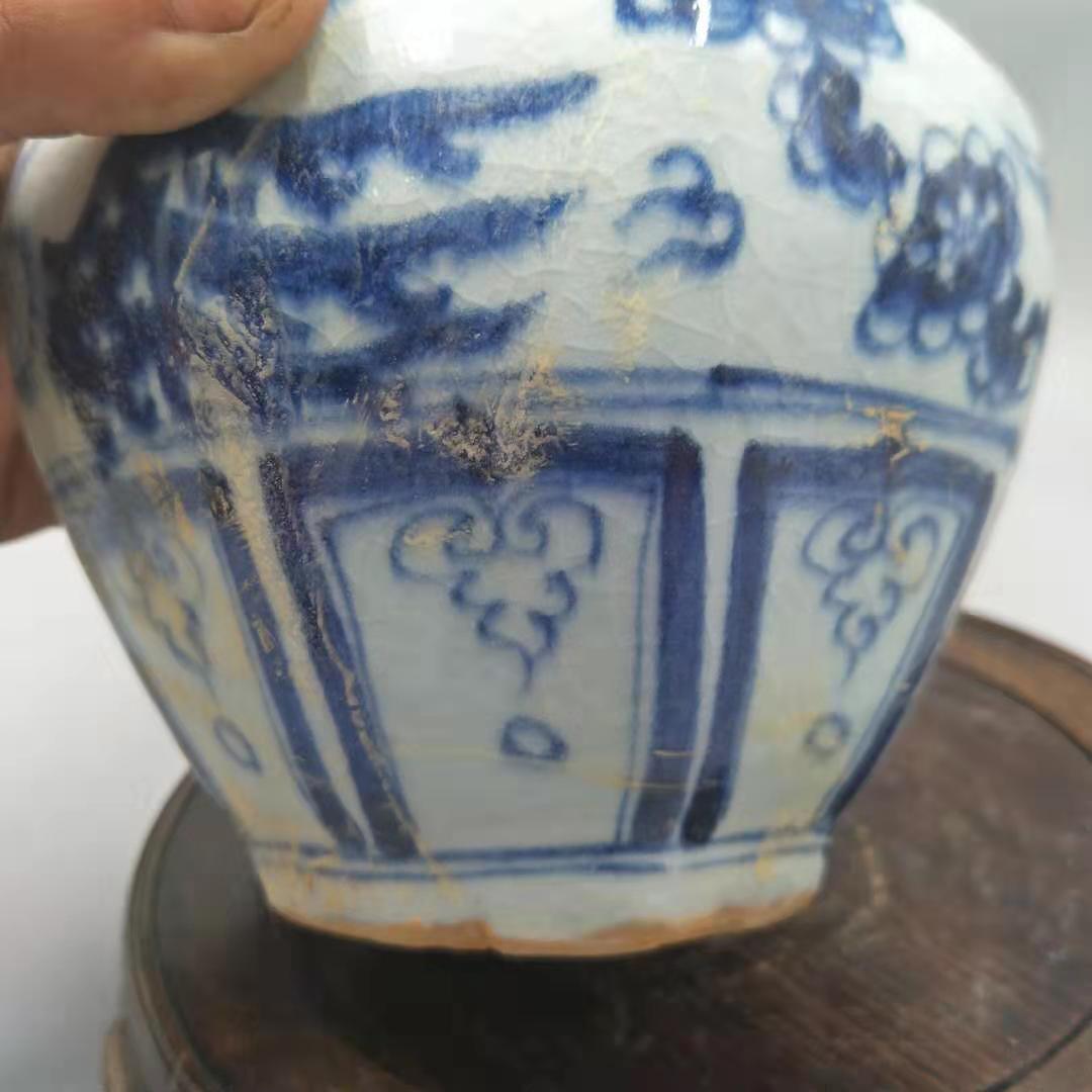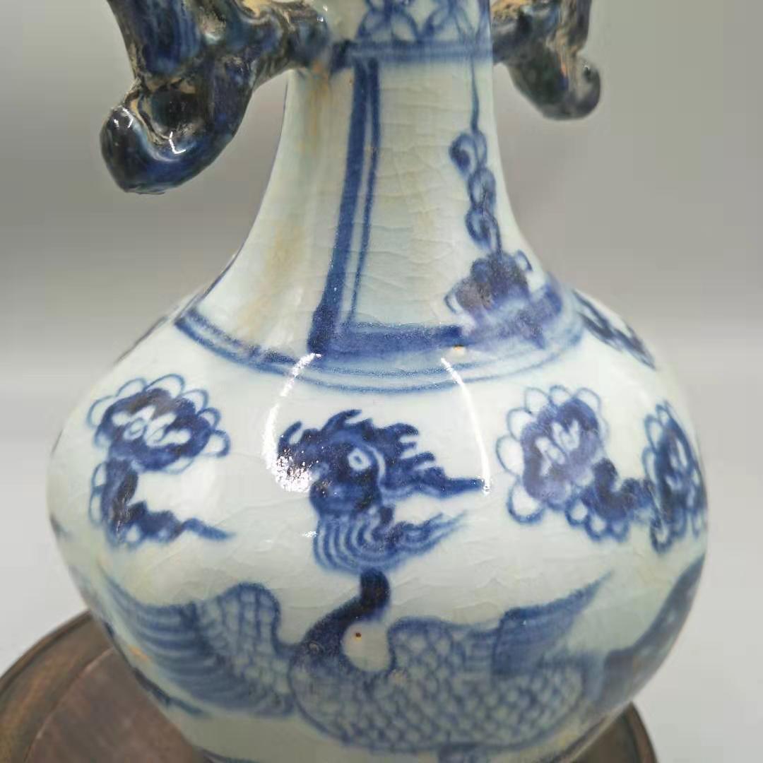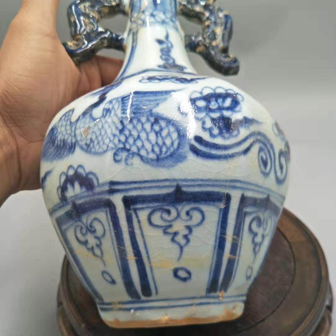 Yuan Dynasty blue and white hexagonal painted phoenix picture crack glaze double-ear bottle antique antique collection old goods antique porcelain small ornaments