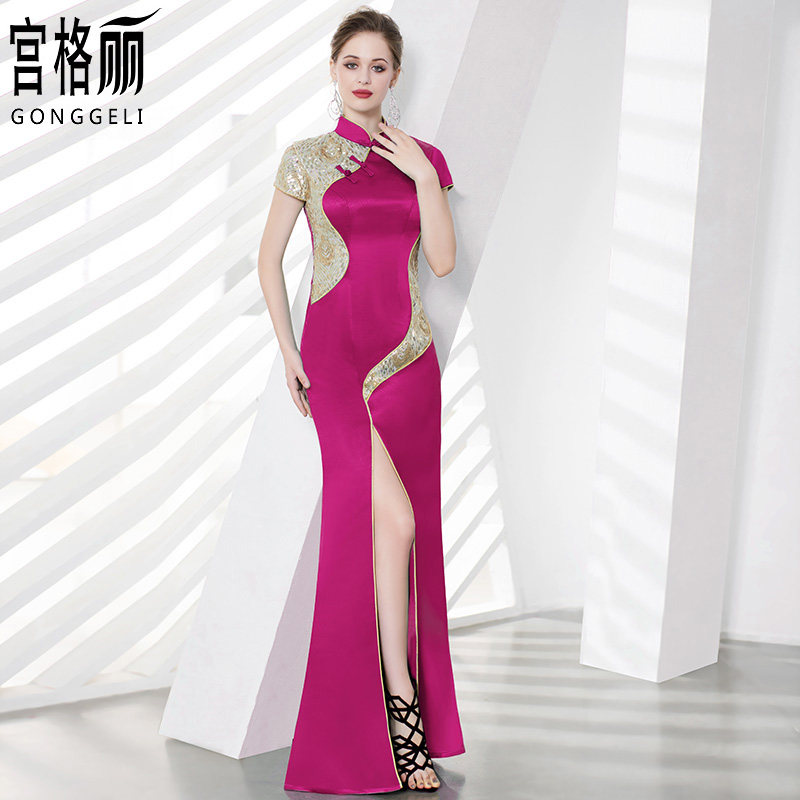 Palace Gri Improvement Qipao Woman's long version of body Slim Dress Banquet Performance Walking Show Qipao Short Sleeve Ocean Dress