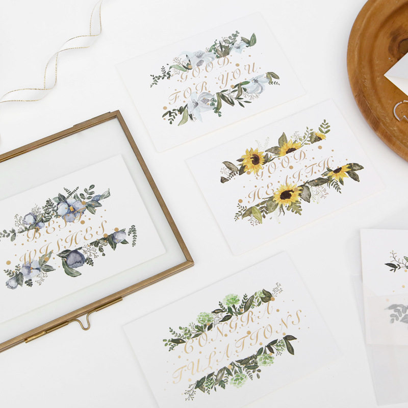 Minimalist bronzed flowers greeting cards, happy blessing blank small card thanks to message card literature and art with envelope