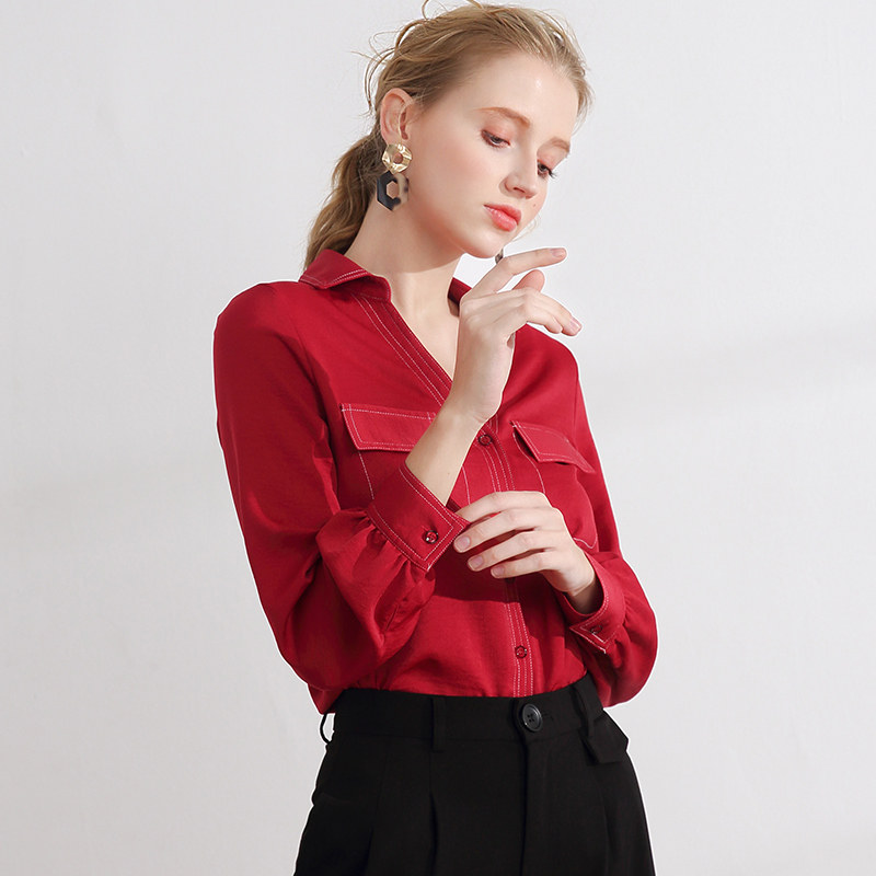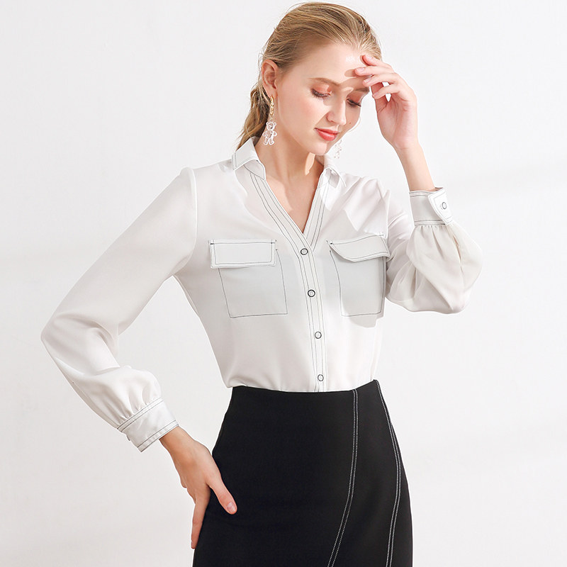 2021 autumn new temperament slim shirt women Joker long sleeve V-neck chiffon shirt retro lapel solid color shirt