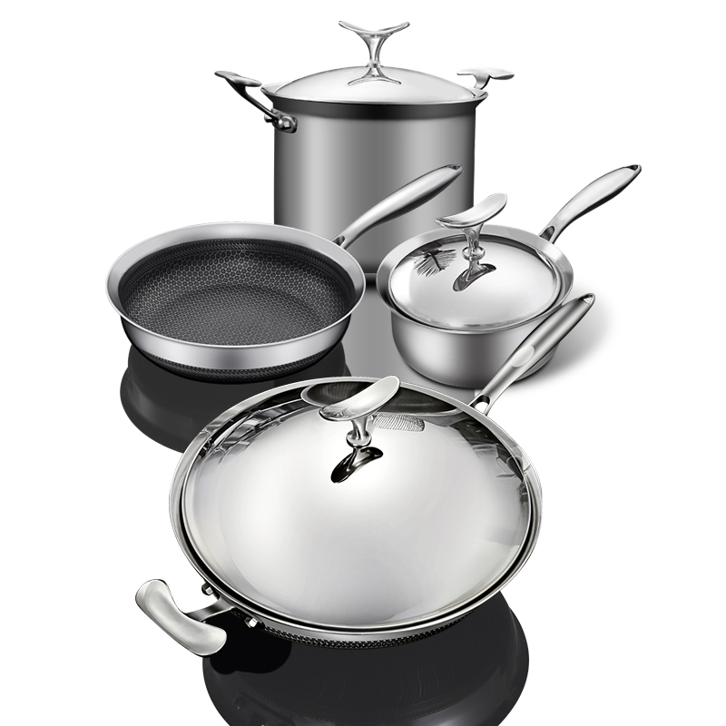 The four-piece set of pots and pans (wok + frying pan + soup pot + milk pot) is set in combination