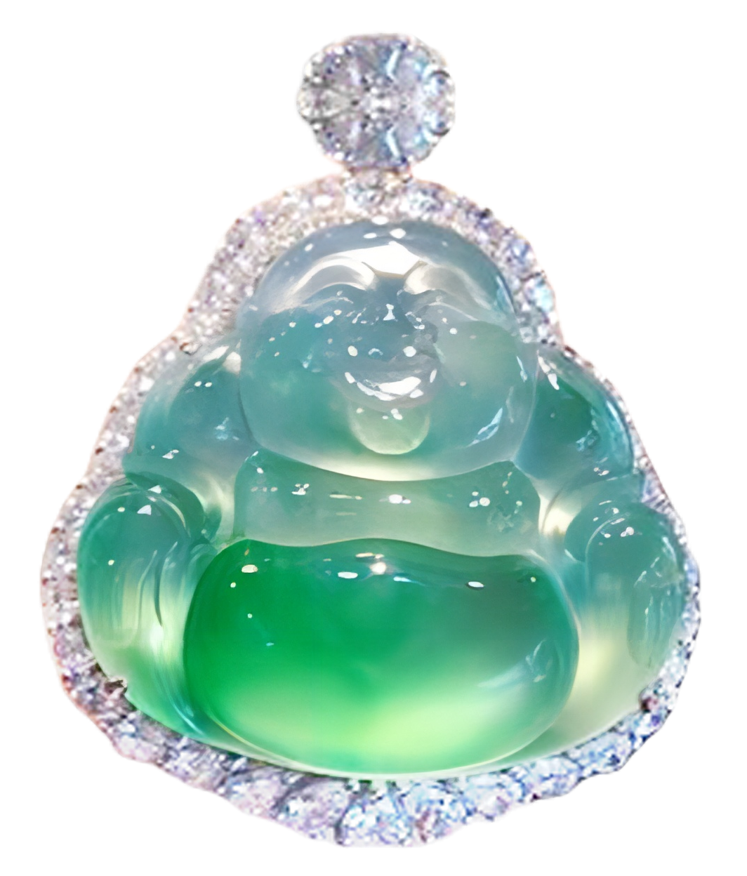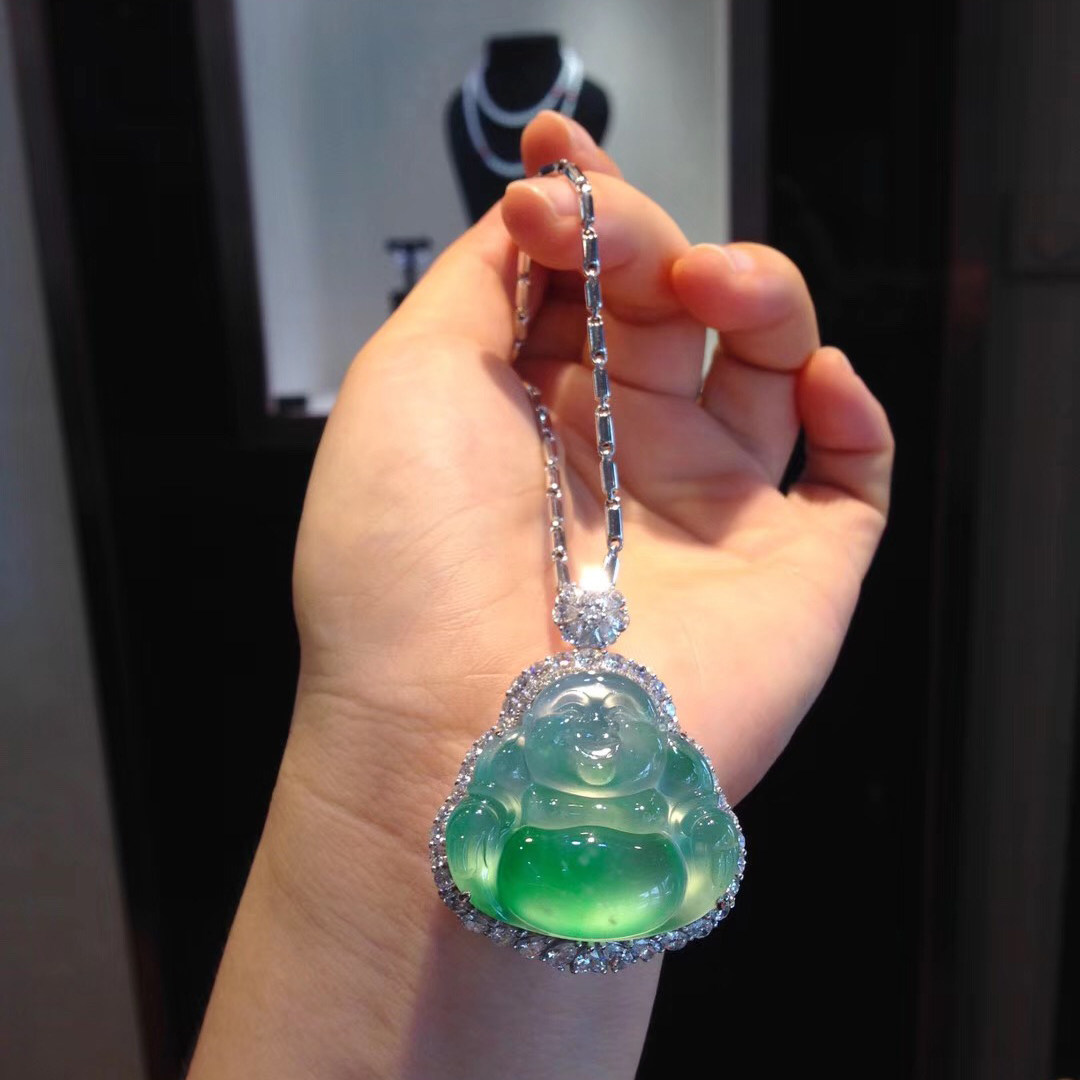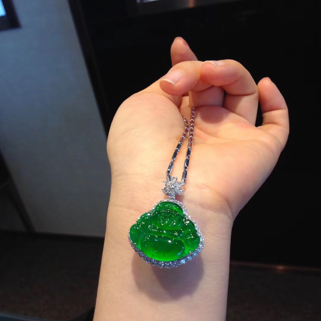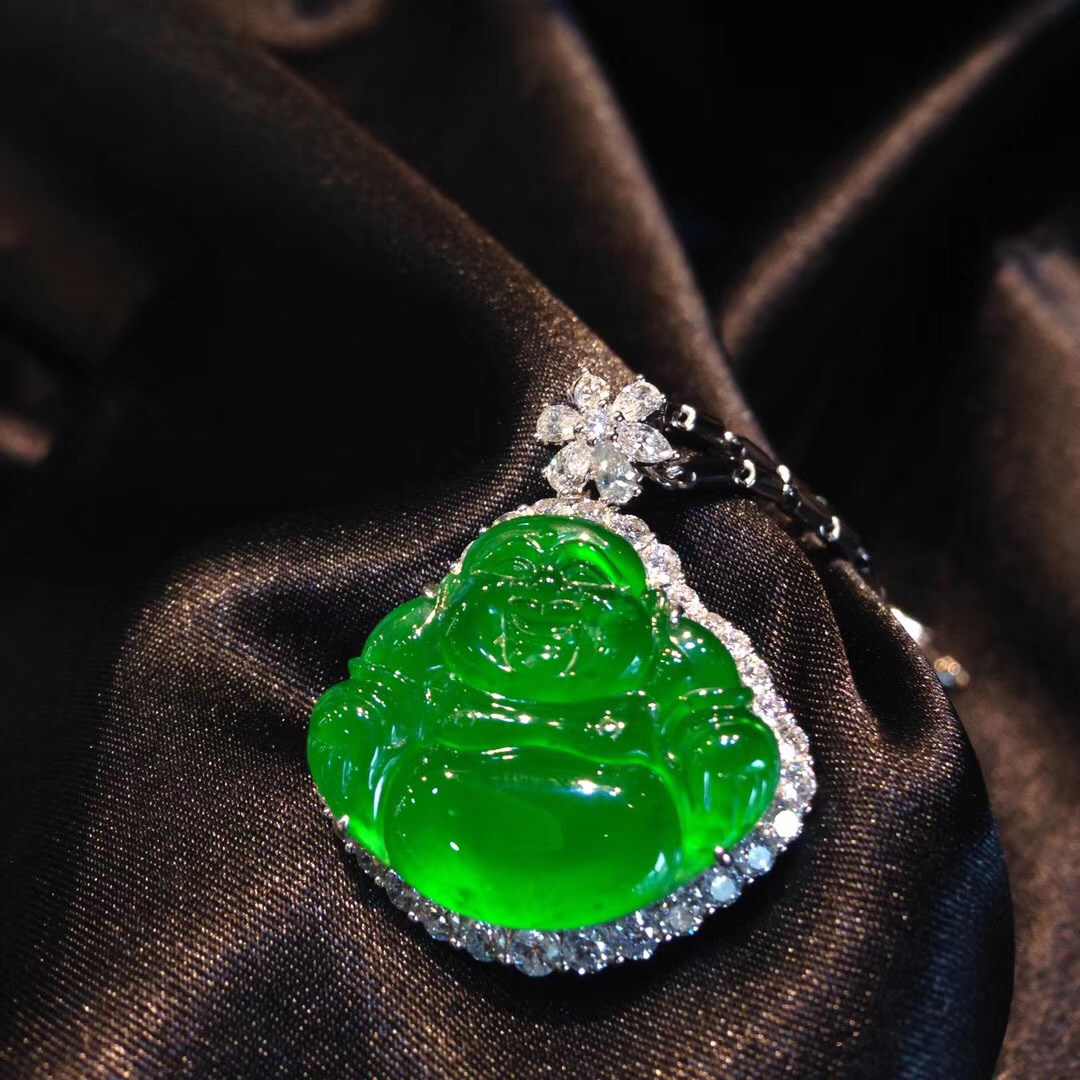 Natural Jade Pendant Laughing Jade Buddha Ice Seed Avalokitesvara Jade Pendant Men's and Women's Pendant Yang Green 18K Gold Inlay