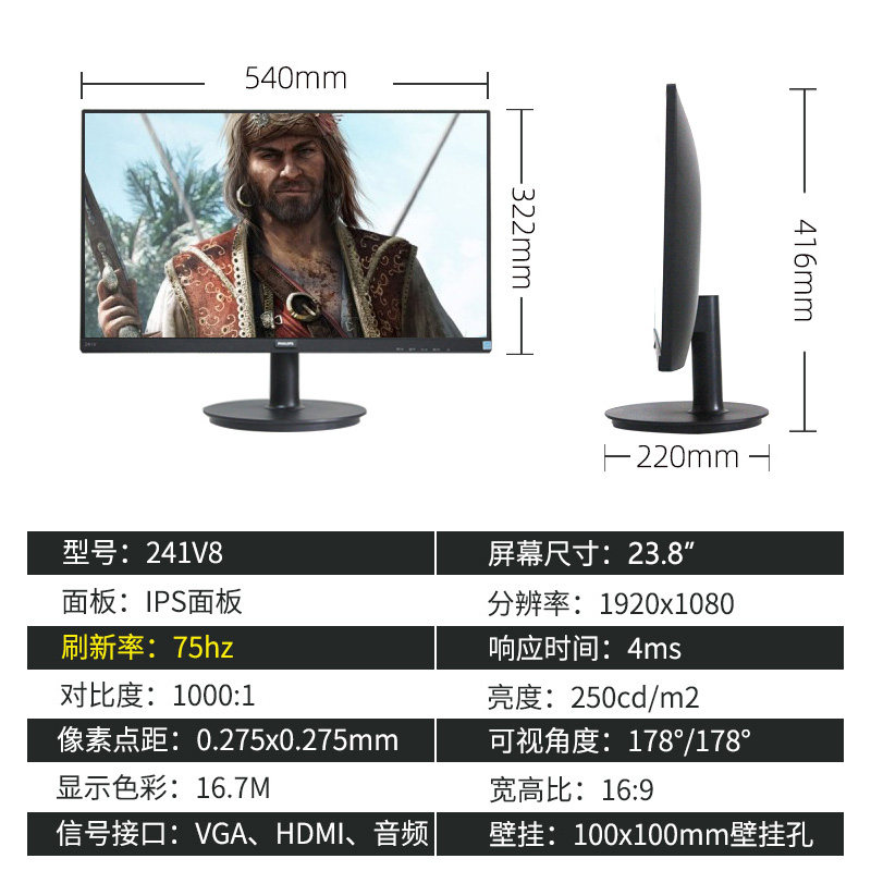 Philips 24-inch ips Display 75Hz electric race game PS4 Drawing design hdmi Full HD 241v8