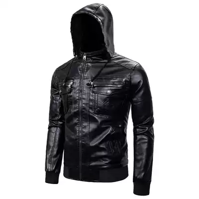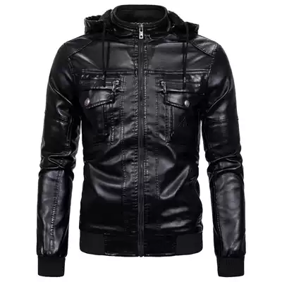 Winter plus velvet padded leather men's black locomotive jacket men's imitation sheep leather hooded lamb velvet coat tide
