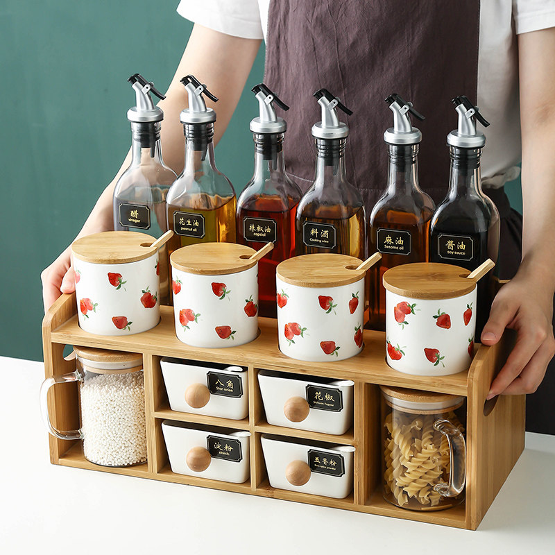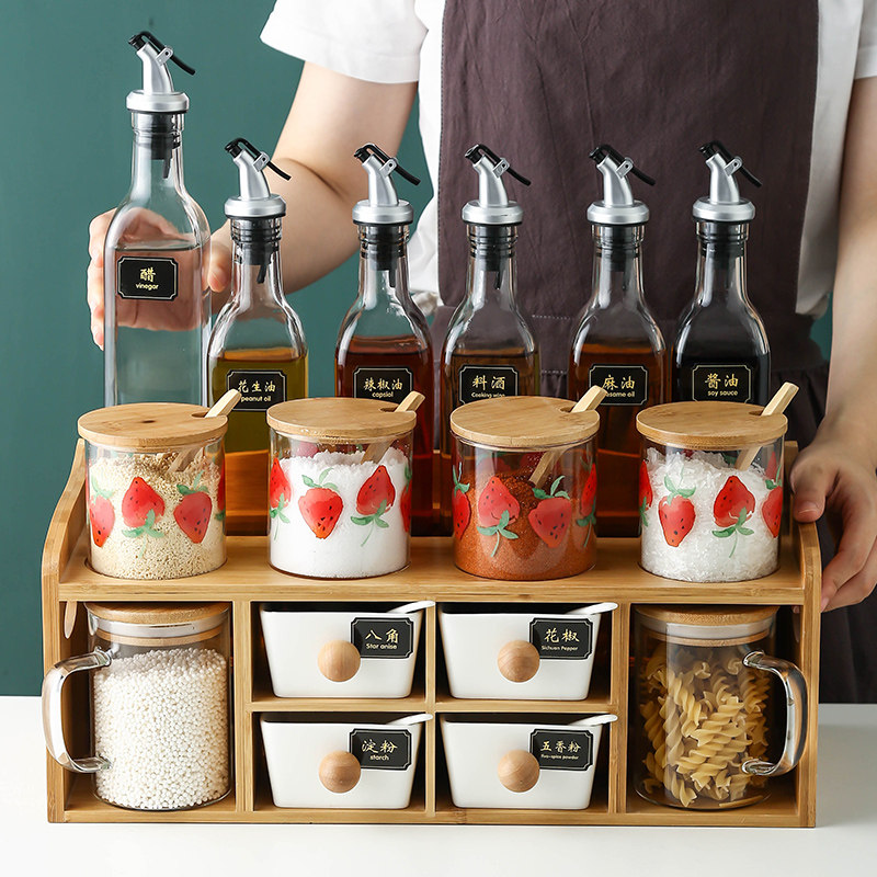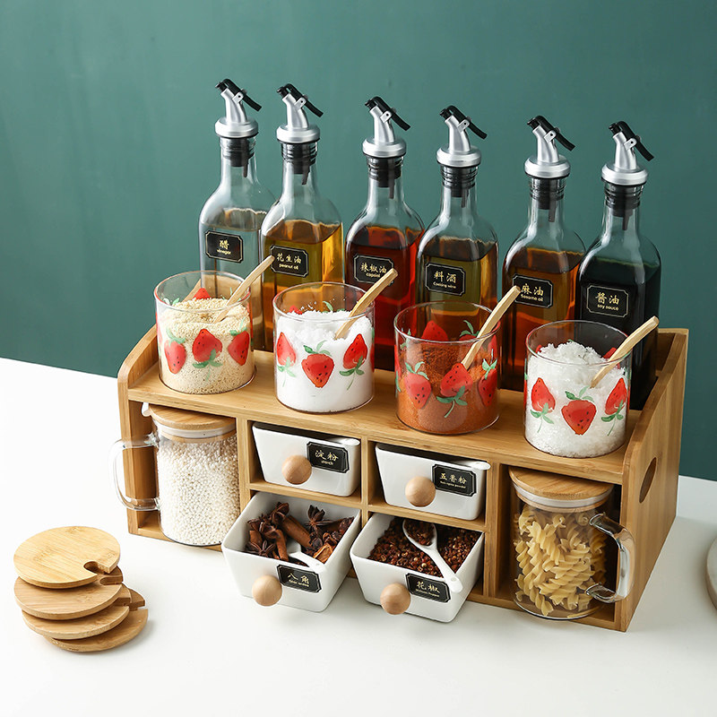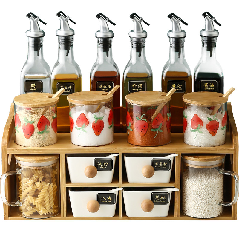 Kitchen Glass Sauce Box Day Style Wind Strawberry Seasoned Jar Sauce Bottle Suit Oil Bottle Combined double shelf