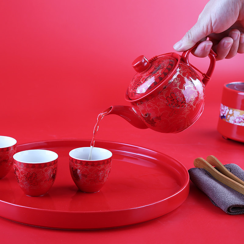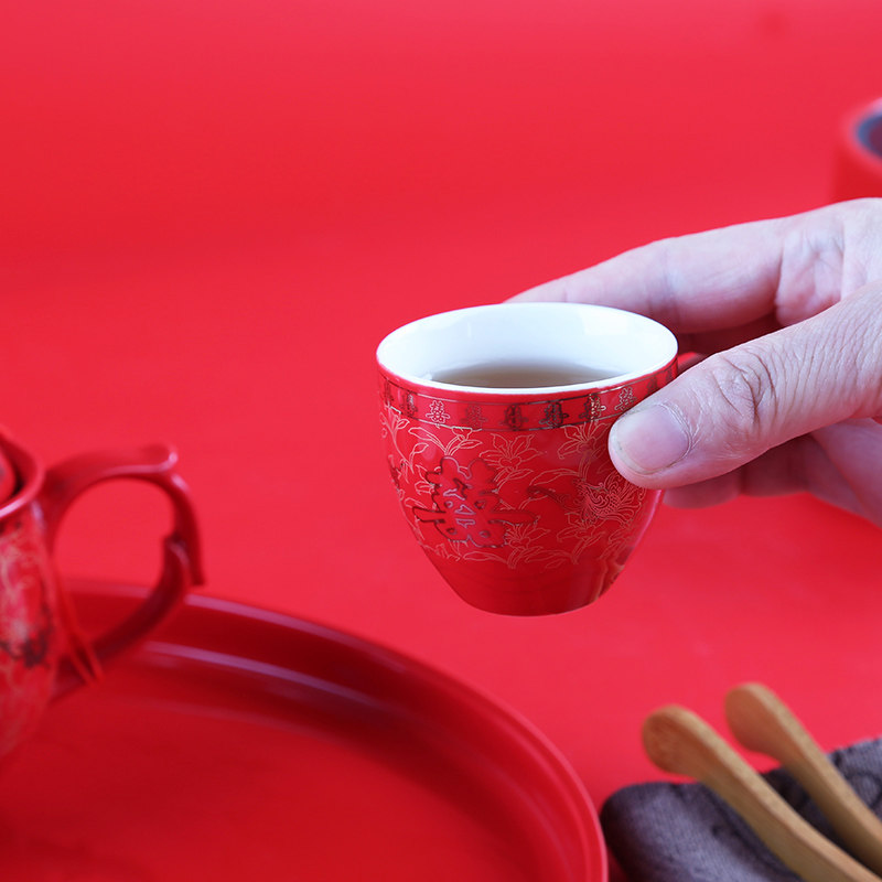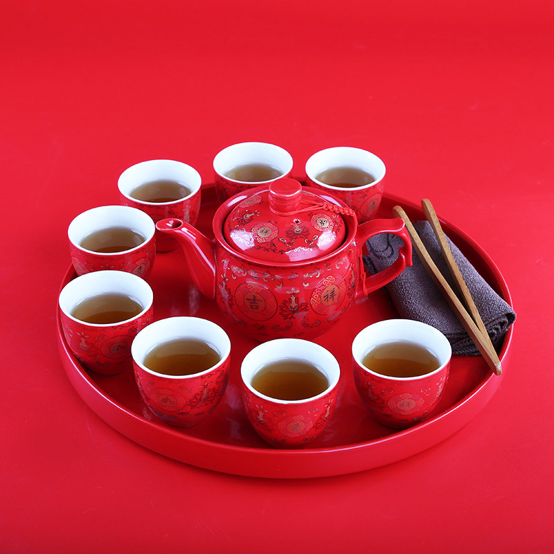 One pot of 8 cups of red porcelain disc (double ectopic) a pot of 8 cups of red porcelain disc (auspicious ruyi) a pot of 8 cups of red porcelain disc (engraving double joy) a pot of 8 cups of red porcelain disc (lead-up)