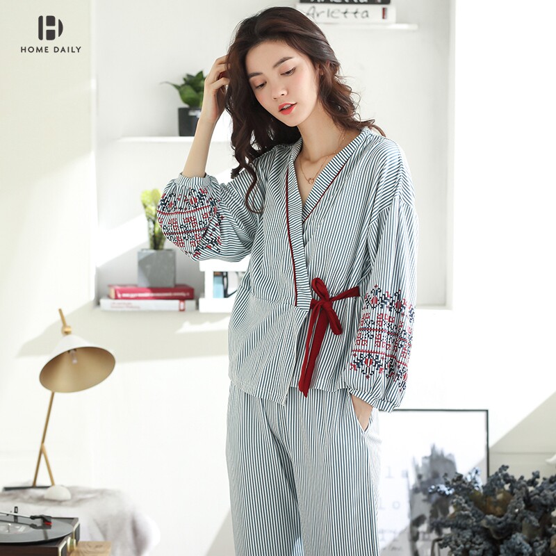 Kimono Pyjamas Spring Autumn Pure Cotton Long Sleeves Lace Korean version printed Sexy cute All cotton Home Suit Autumn Winter