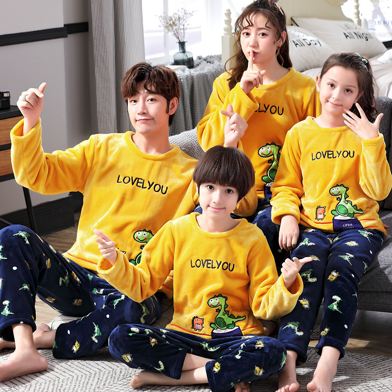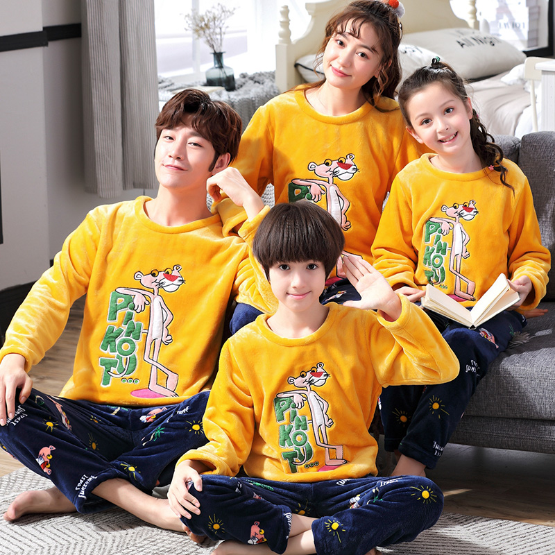 Autumn and winter style Parenting Pyjamas Coral Suede Family of three-mouthed Thickened Cartoon Cute Suit Boy Girl's Home Clothes