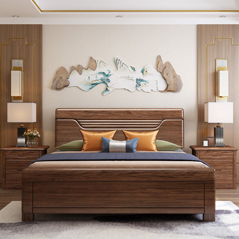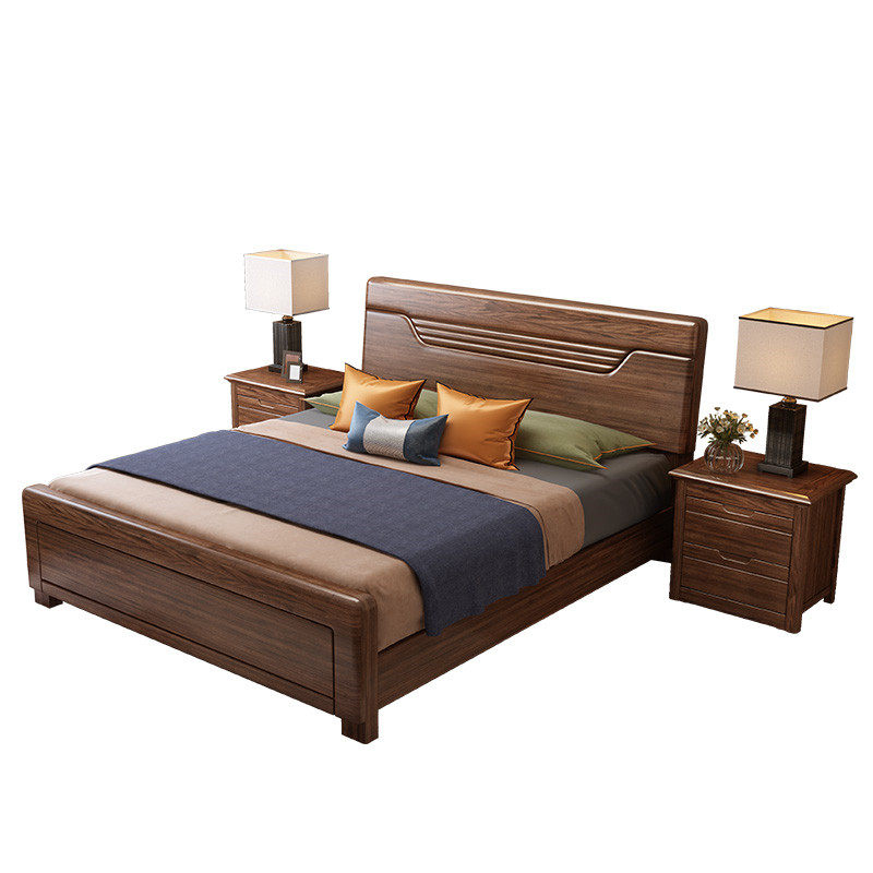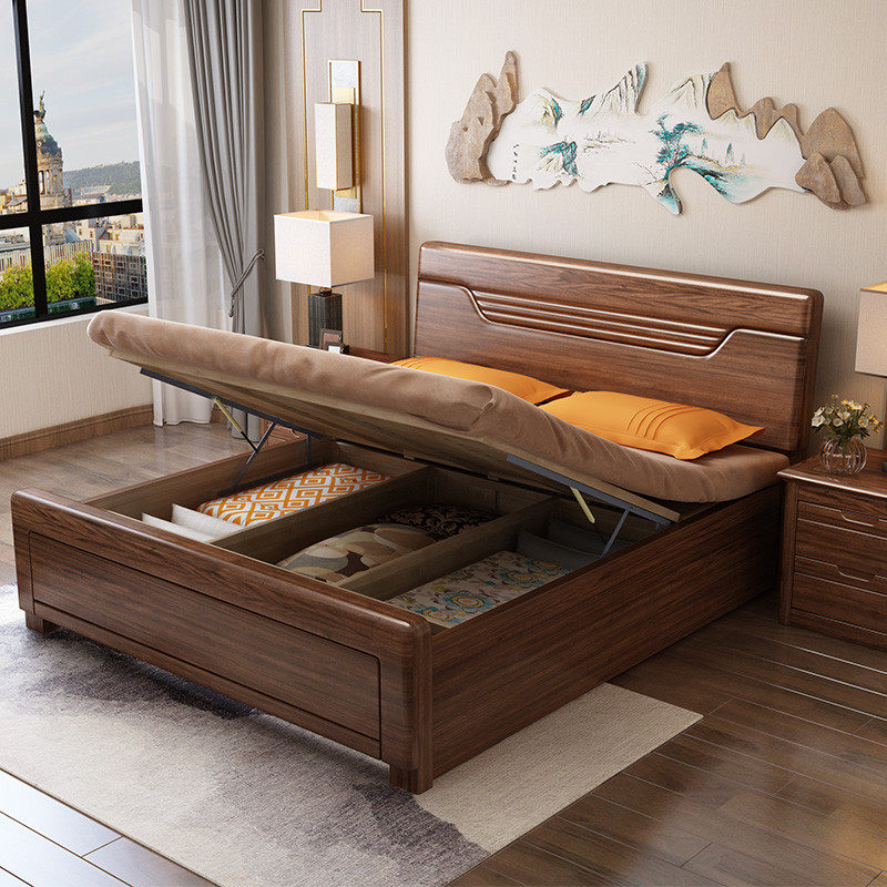 Solid wood bed walnut 1 5 meters 1 8 meters new modern Chinese style high box storage double bed wood plank furniture