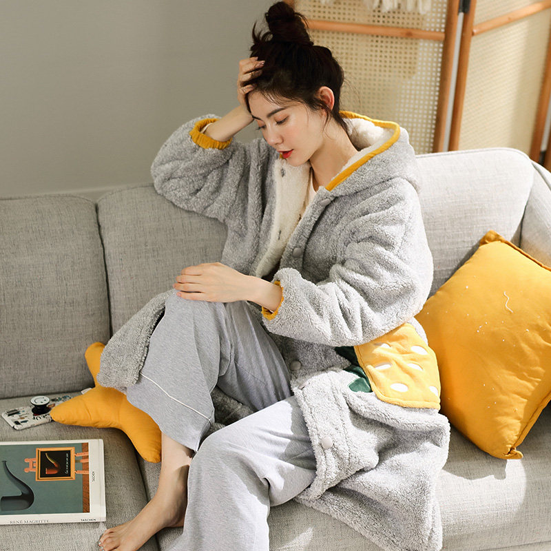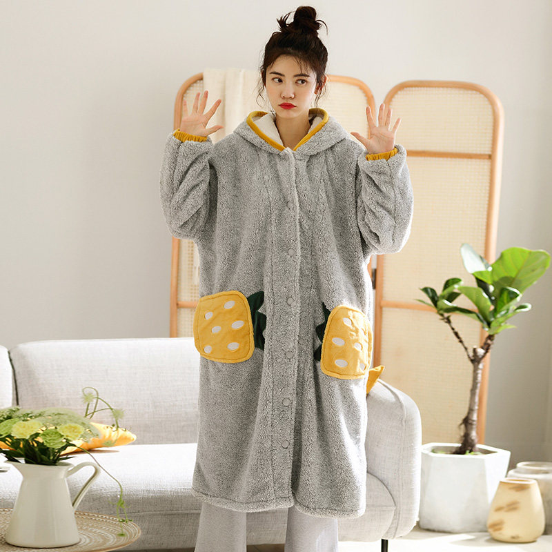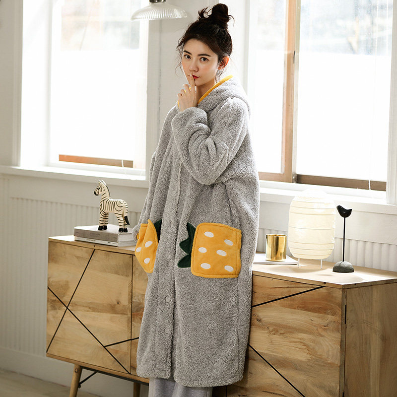 Coral Suede Pajamas Woman Long Version Autumn Winter Even Cap Thickened Garnter Winter Cute Bathrobe Flannel Velvet External Wearing Pyjamas