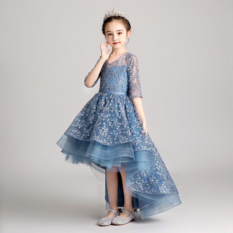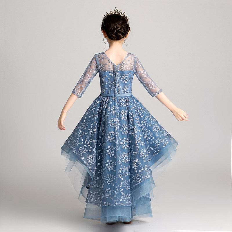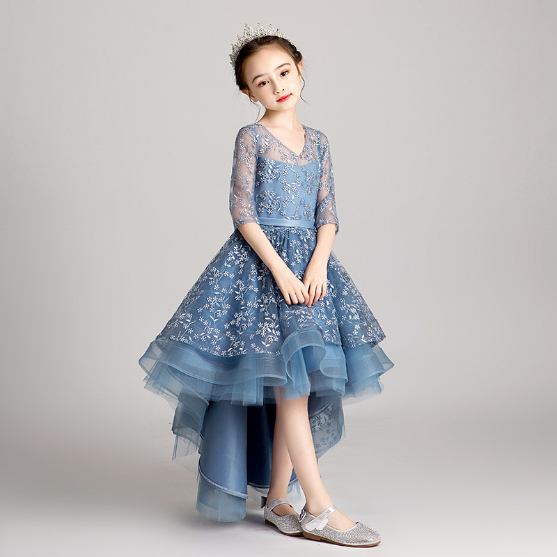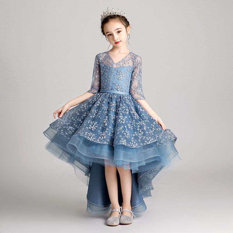 Children's Gown Princess Dresses Dress Girl Fluffy Yarn Birthday Little Girl Blue Florist Wedding Piano Out of Long sleeves