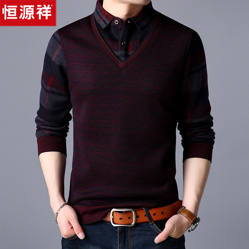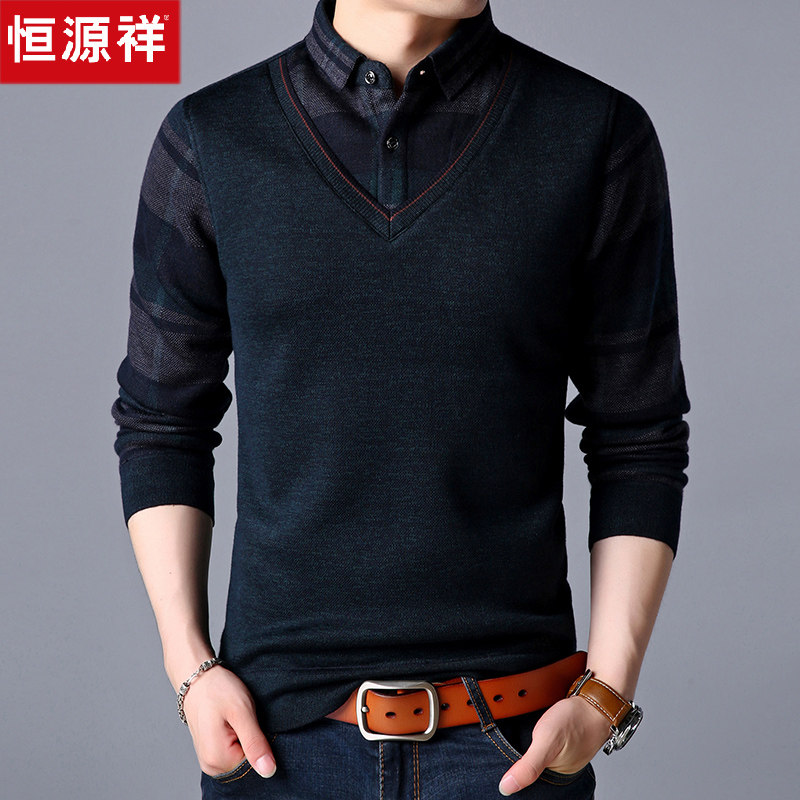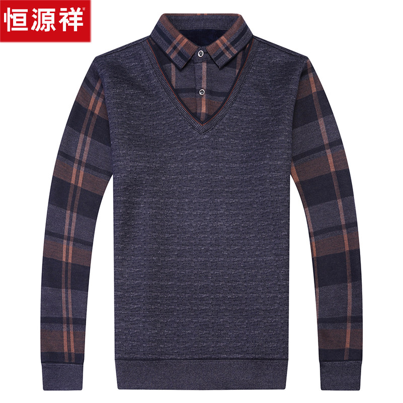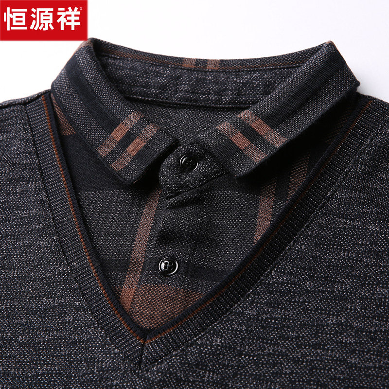 Hengyuan Xiang Chunqiu Thin Section Long Sleeve T-shirt Dad Middle-aged Men's Clothing Fake Two Men Sweaters Shirt Collar Bottom Jersey