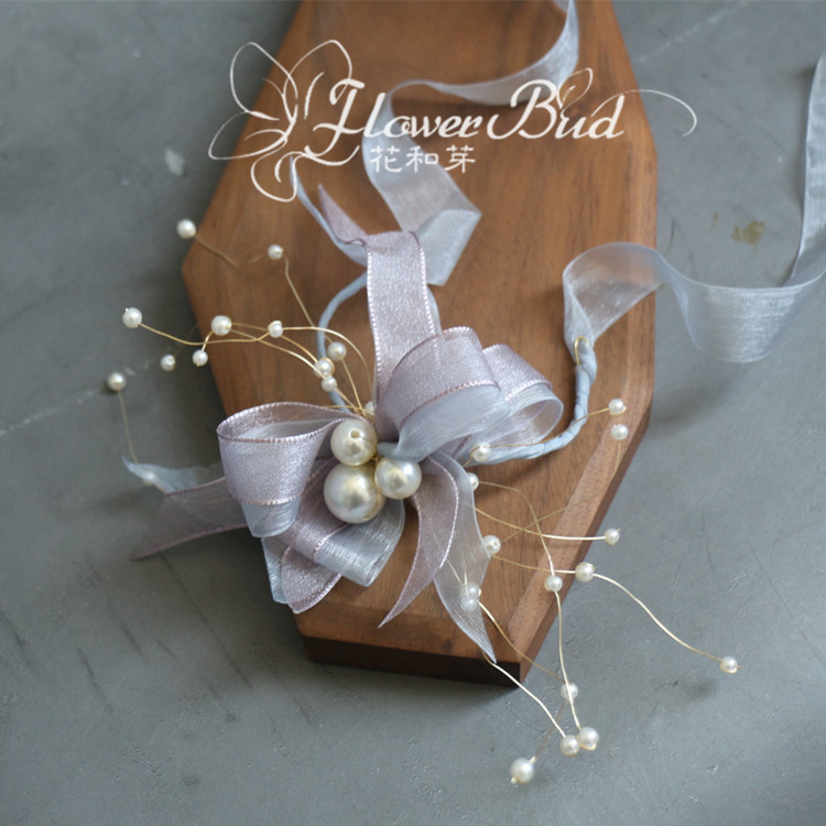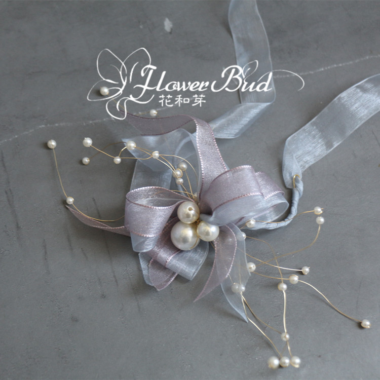 ins beautiful pearl tassel smoky purple blue bow ribbon wrist flower bride bridesmaid children show hand flower