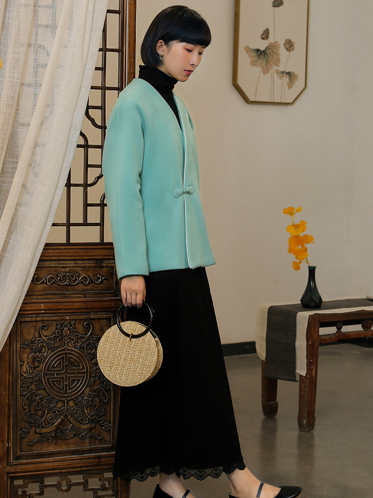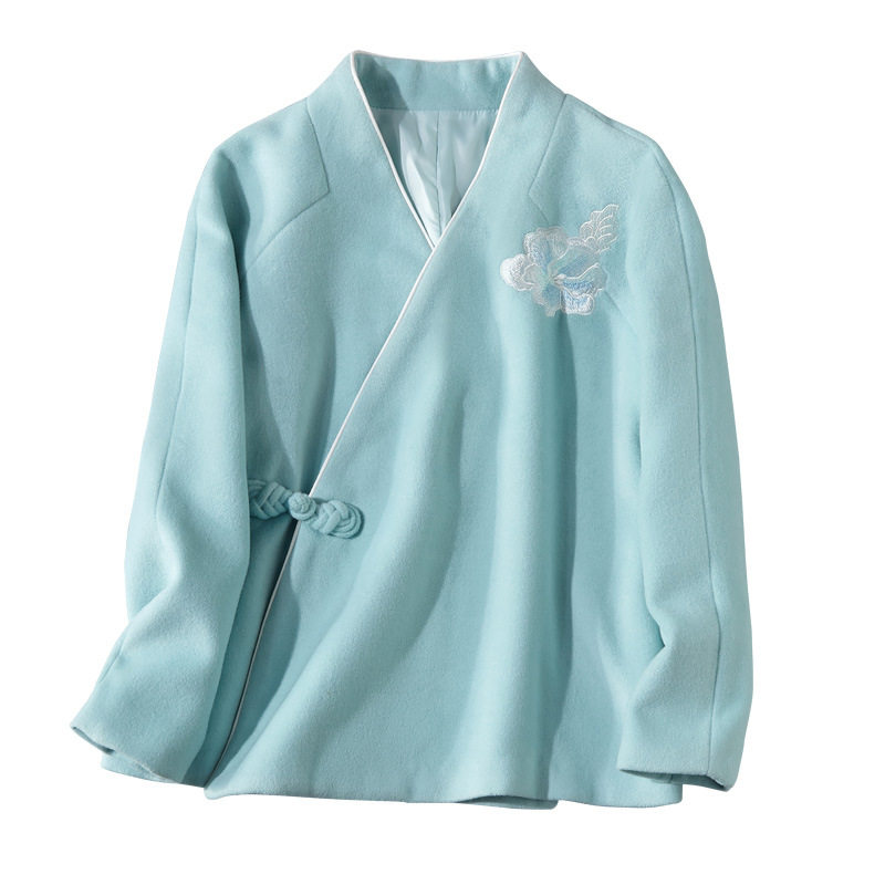 Chinese style tea clothing women's tea art clothing Tang suit Hanfu women's improved cross-neck woolen jacket national style coat autumn