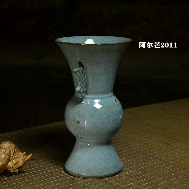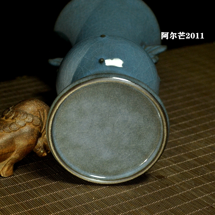 World intangible cultural heritage imitation Song official kiln iron tire Longquan celadon blue tip glaze full product ornaments double-winged halberd bottle