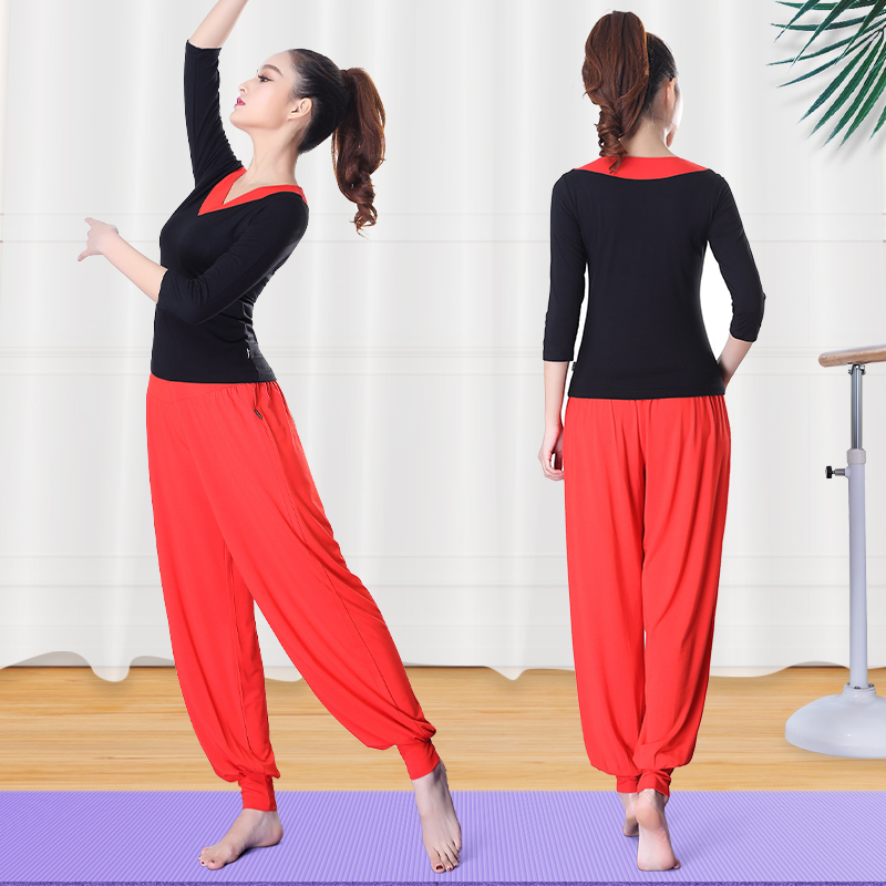 Pink and gray three-quarter sleeves Gray harem pants Red short-sleeved top Red harem pants Black and red long-sleeved red harem pants Red three-quarter sleeve top Red harem pants Black and purple short-sleeved purple harem pants
