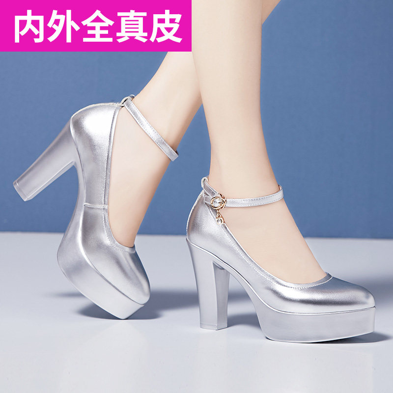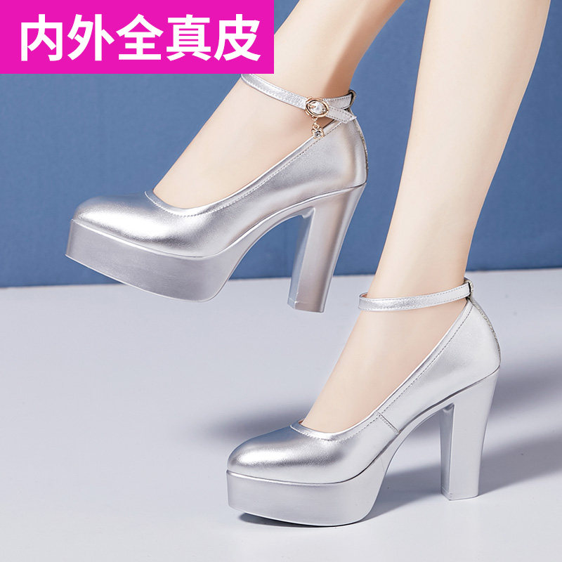 Silver soft cowhide model cheongsam training special catwalk high-heeled shoes thick-heeled platform leather bag shoes women