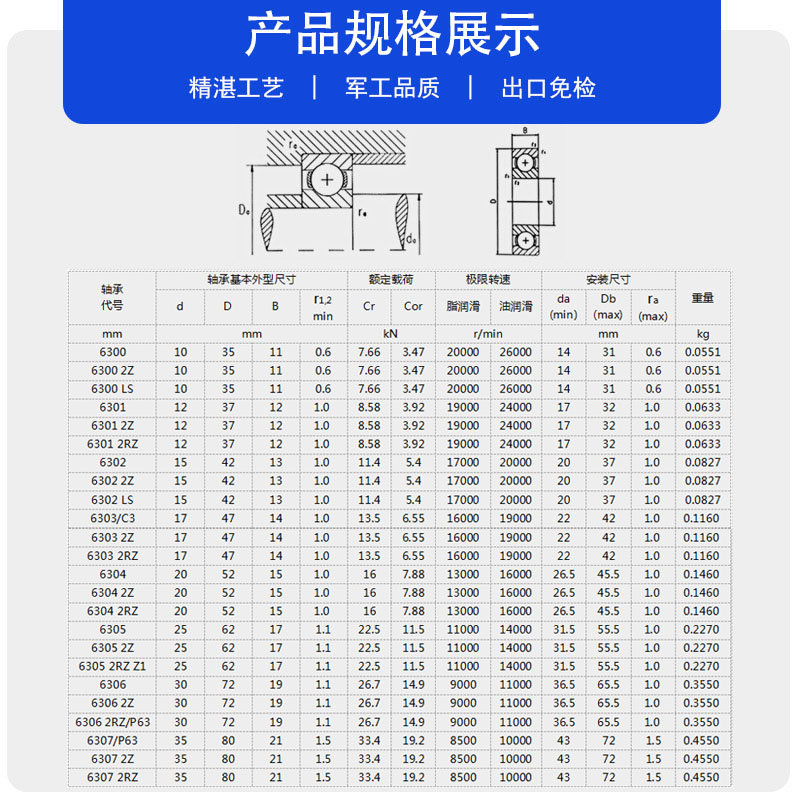6300 (open bearing without dust cover) 6300-2Z (double-sided iron seal dust cover) 6300-2RZ 2LS (double-sided adhesive seal dust cover) 630