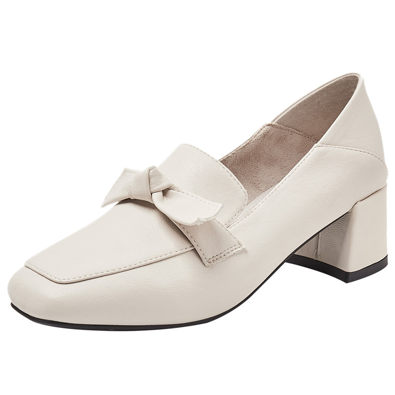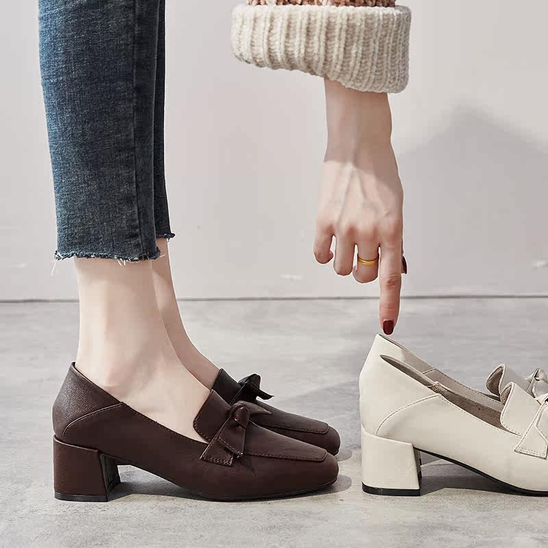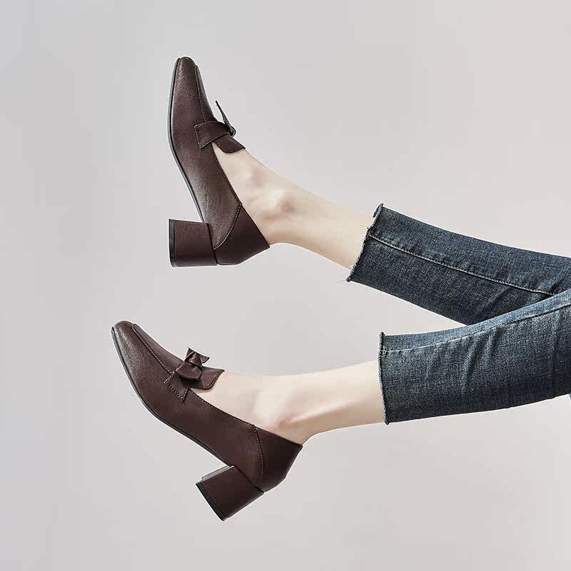 Net red thick heel shoes women's 2022 spring retro bow square toe high heels women's all-match British style small leather shoes