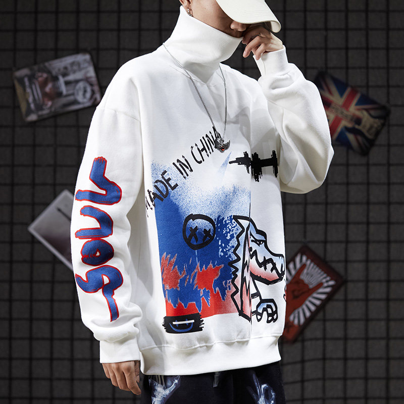 Autumn round turtleneck thick cotton T men pullover long-sleeved European and American hip-hop cartoon printing tide brand loose couple velvet top