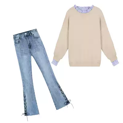 Autumn and winter small man with high foreign style female temperament Net red light mature fashion age denim pants two-piece suit