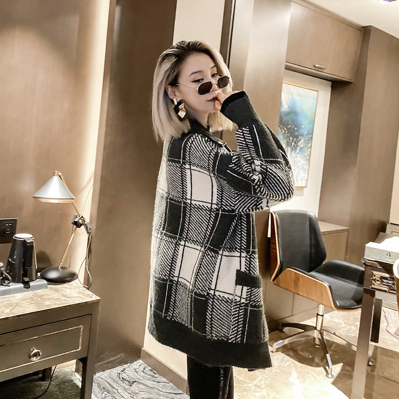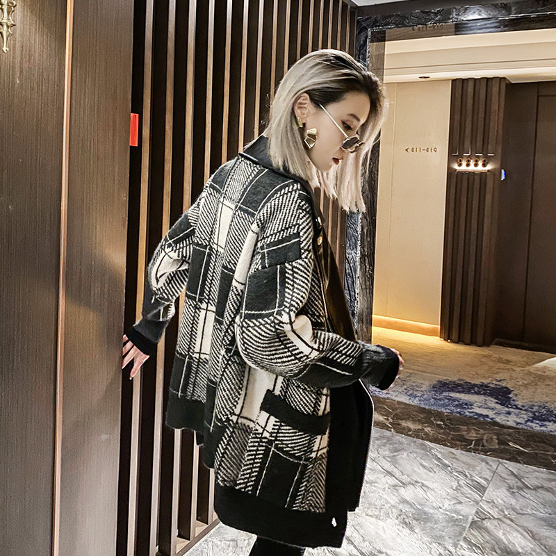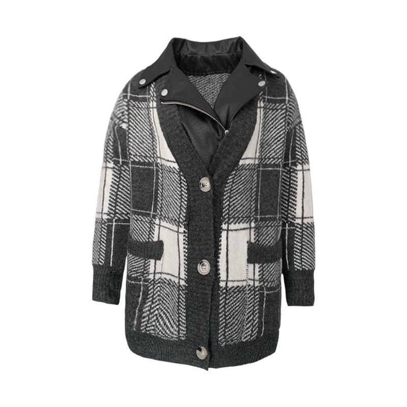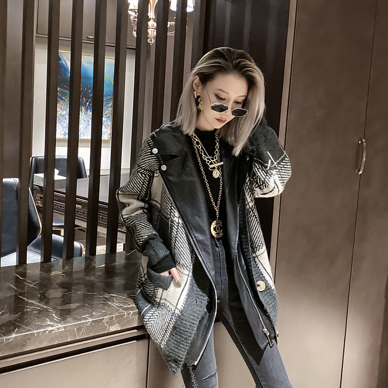 Knitted cardigan women's loose 2020 spring new European station fashion plaid Foreign pie leather U stitching sweater jacket