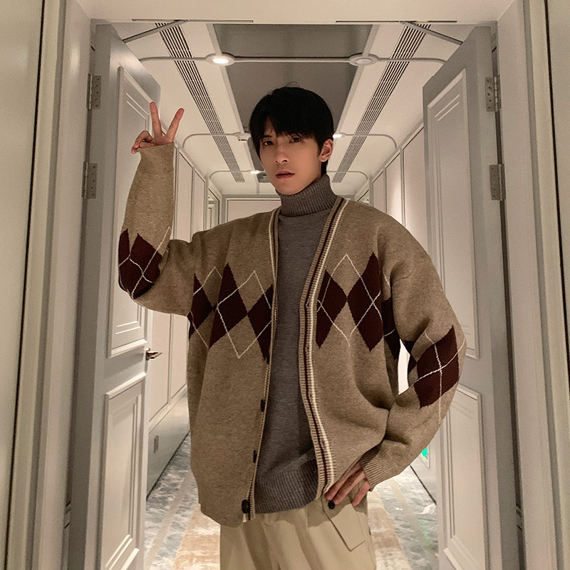 HUALUN retro college style sweater men's cardigan couple knitwear Korean wave student sweater loose coat