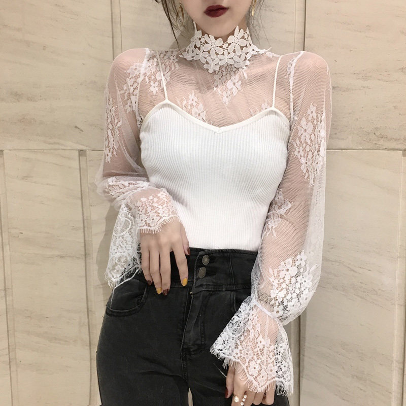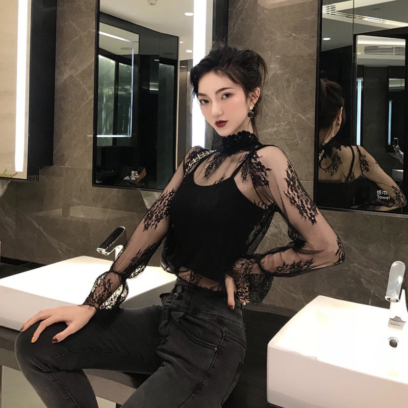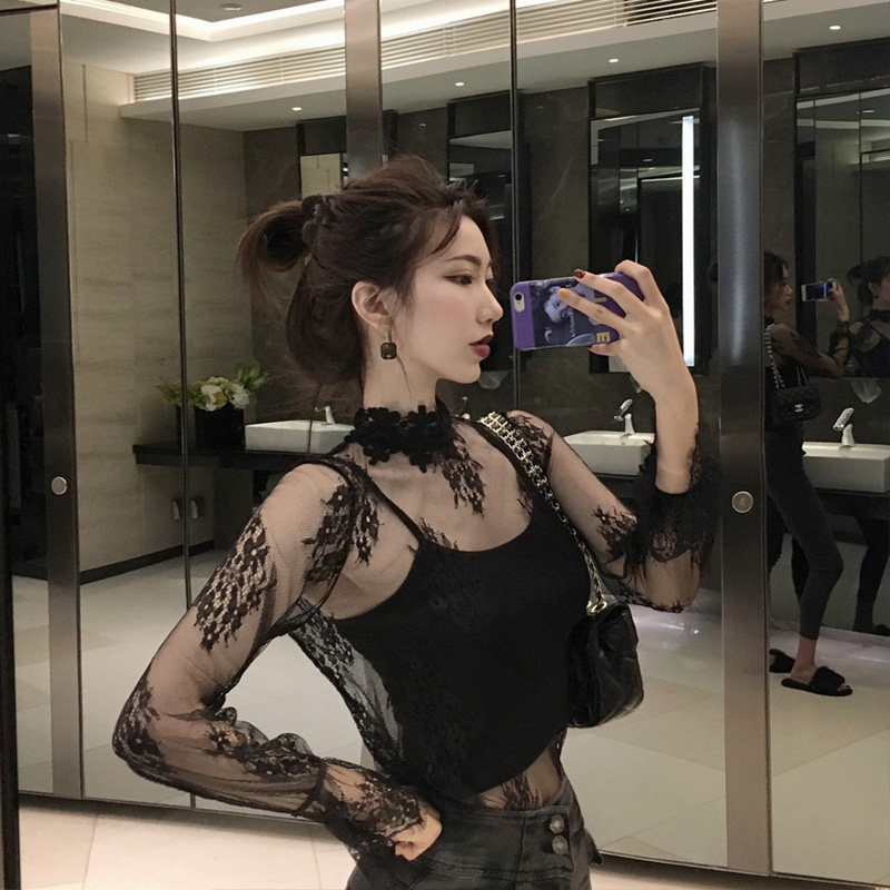 Black lace base shirt women's mesh new style of summer Western style shirt long sleeve sexy tight cutout top