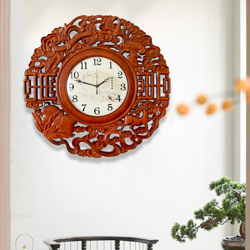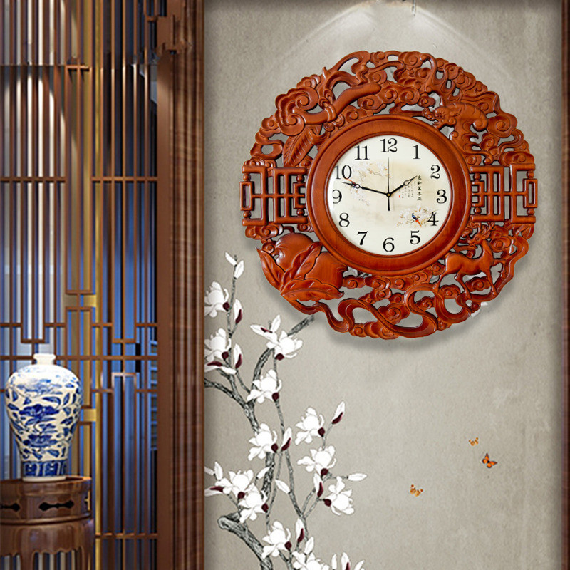 Kou Anna New Chinese style solid wood carving Chinese style silent clock Living room decoration bedroom Round quartz wall clock watch