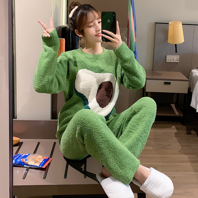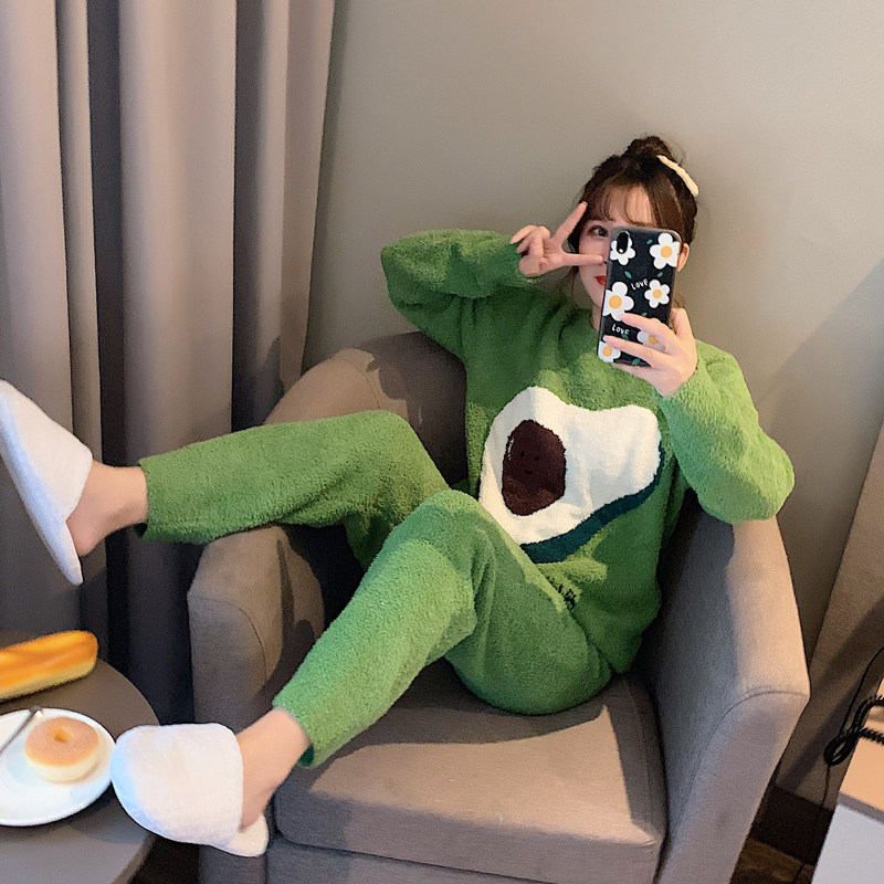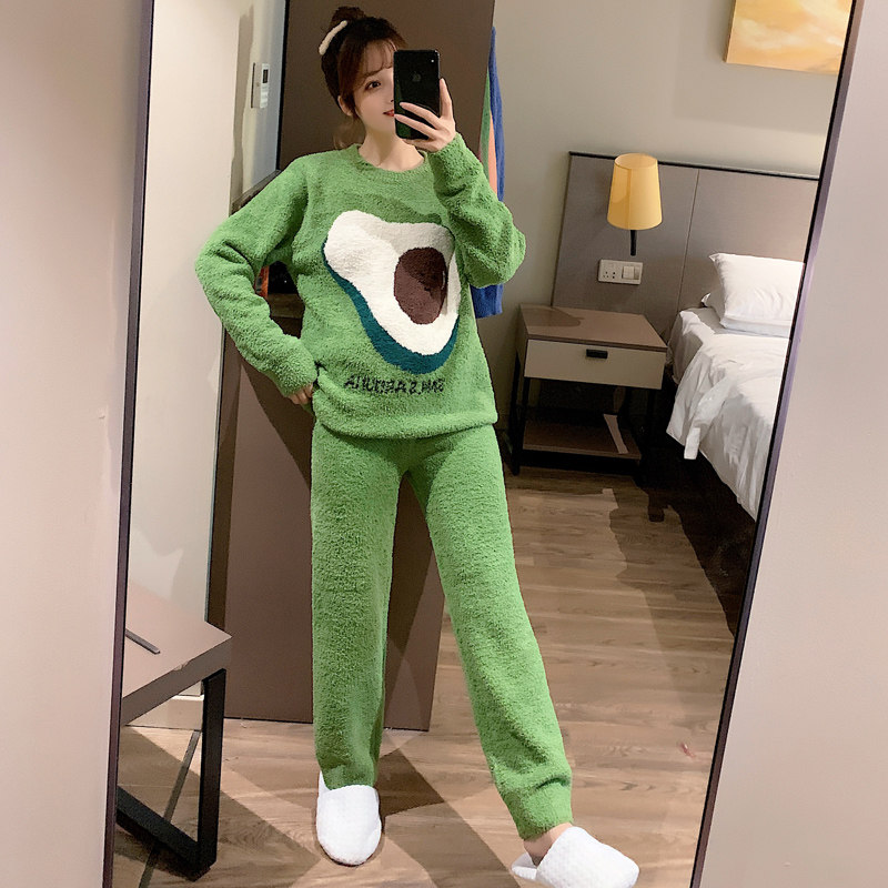 Soft pajamas women's spring, autumn and winter thickened warm avocado green coral fleece home service ins suit