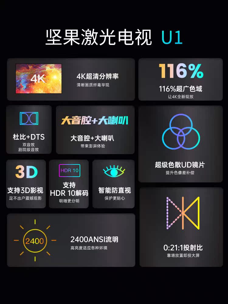 Nut U1 laser TV 100 inch home ultra-high-definition wireless wifi ultra-short-focus smartphone projector home theater 3D daytime direct projection screenless TV projector home theater