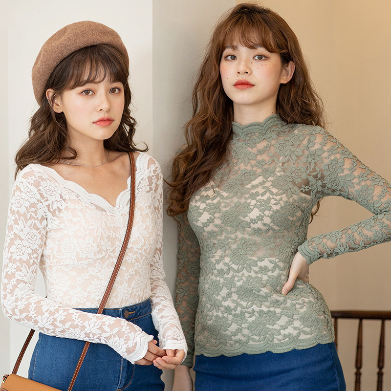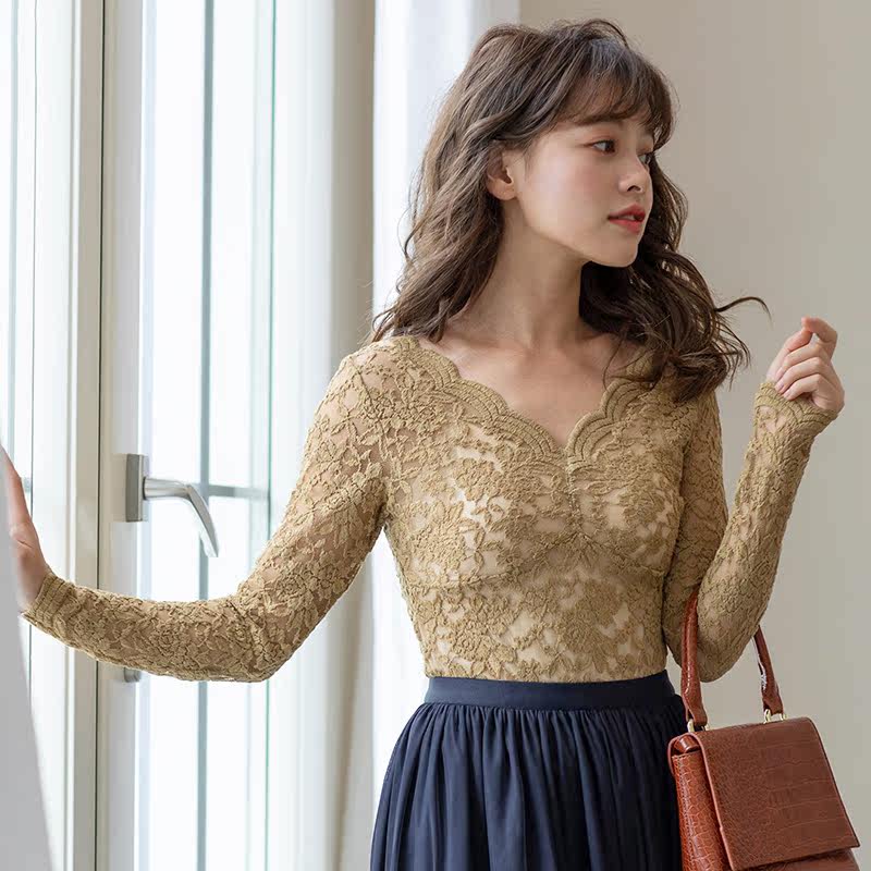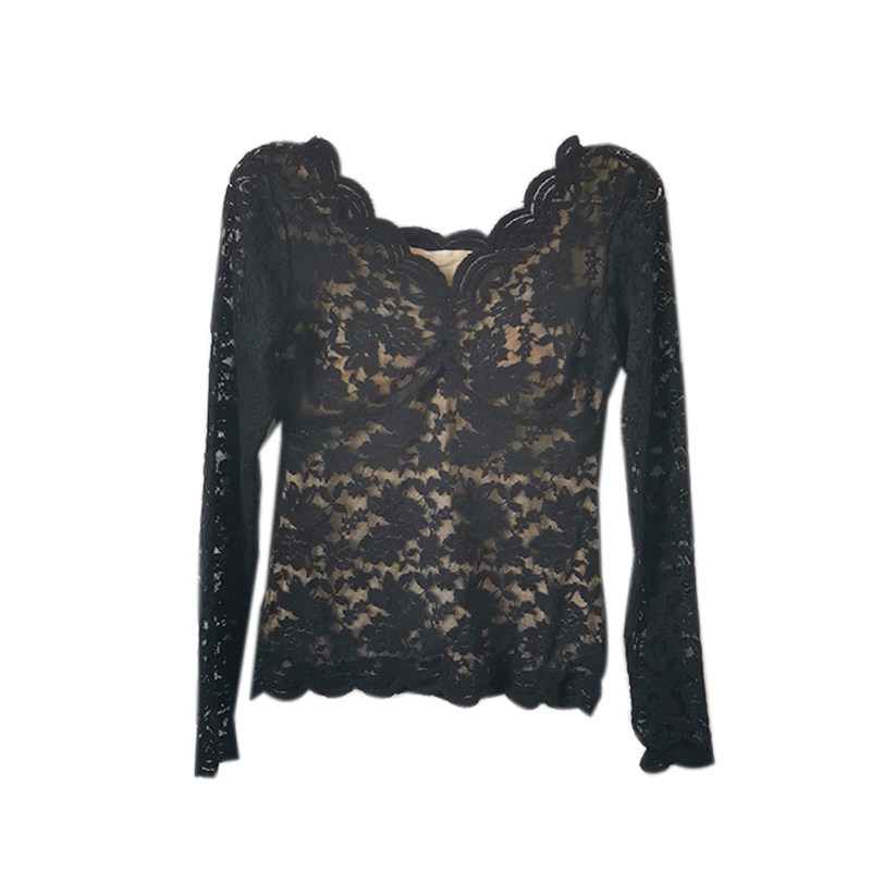 Autumn bottoming shirt women's black Japanese lace fake transparent sexy chest pad thin long-sleeved V-neck mid-neck vest with white S