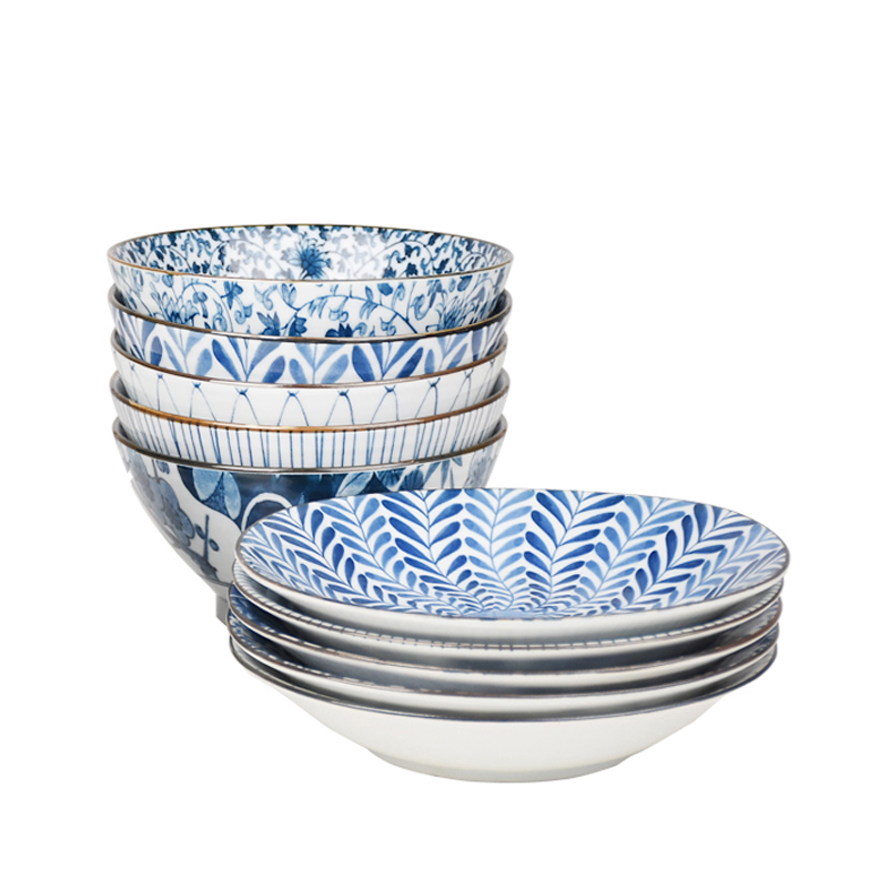 Blue painted medium bowl and 10 plates (imported from Japan) Blue painted large bowl and 10 plates (imported from Japan)
