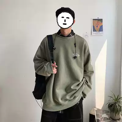 Hipster ins Hong Kong Wind Loose Men Hatless Sweats Korean Trend Round Neck Autumn Pullover Solid Color Coat Blue